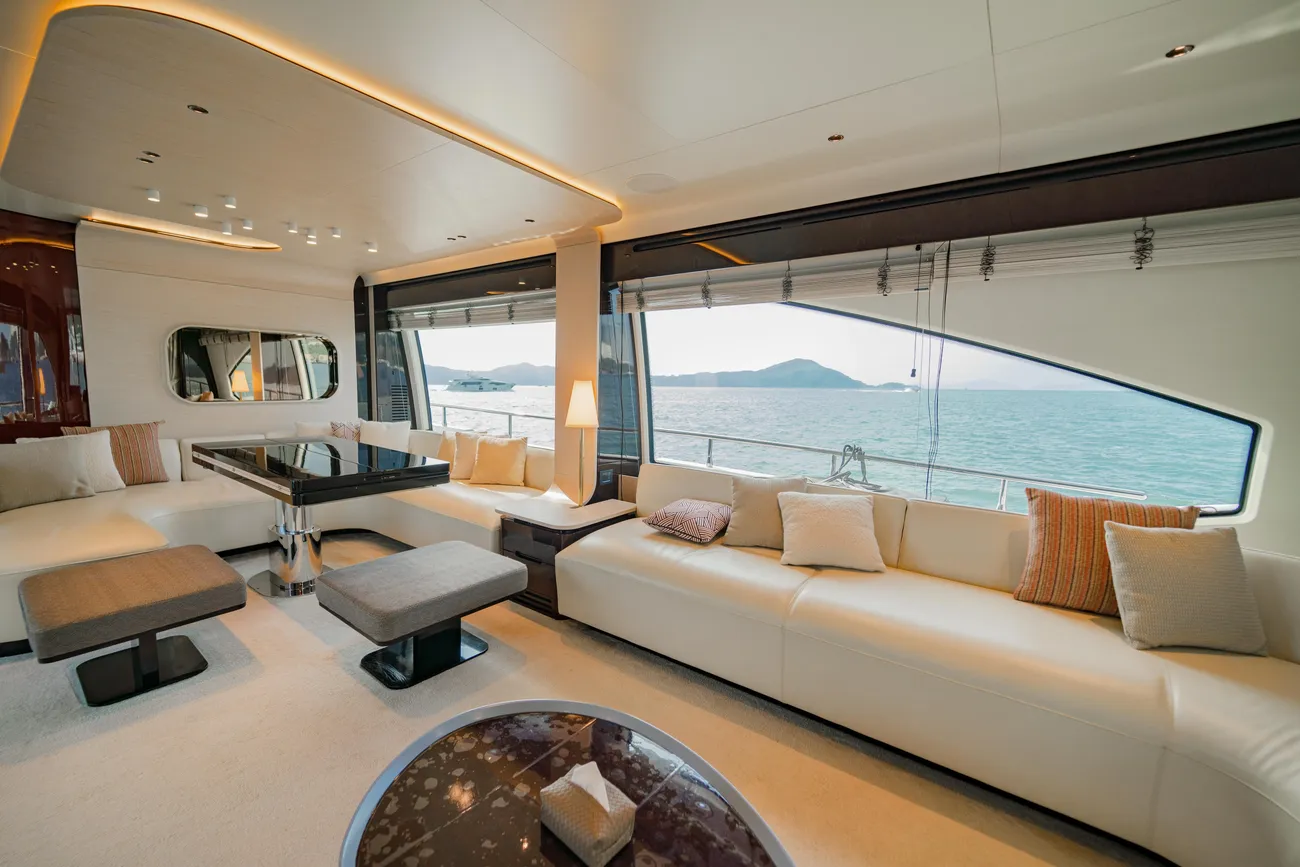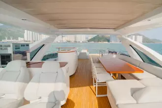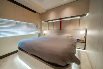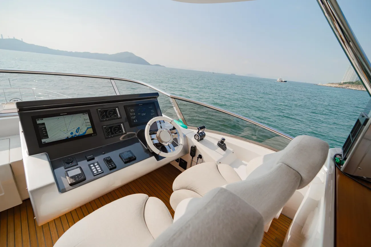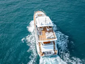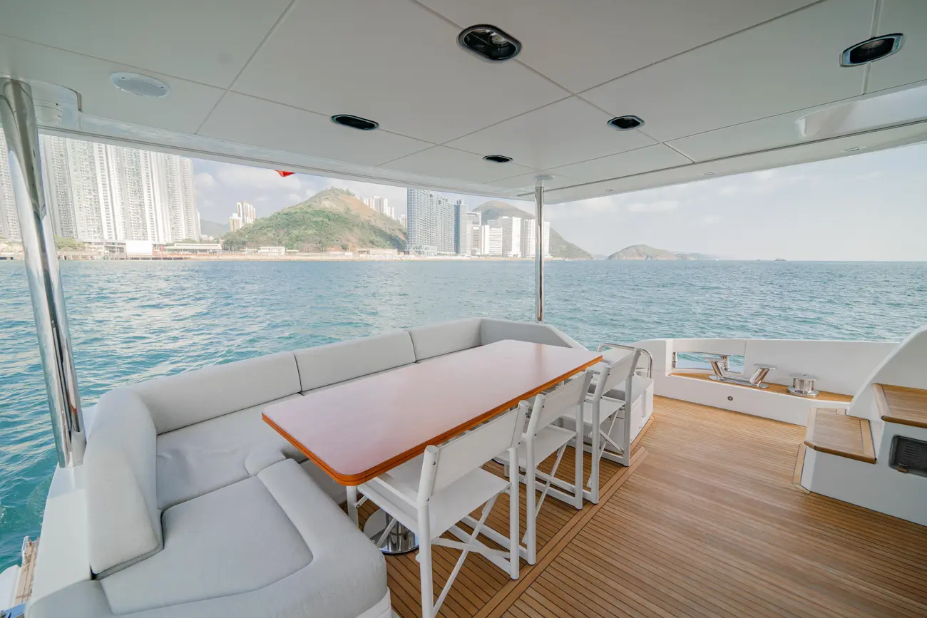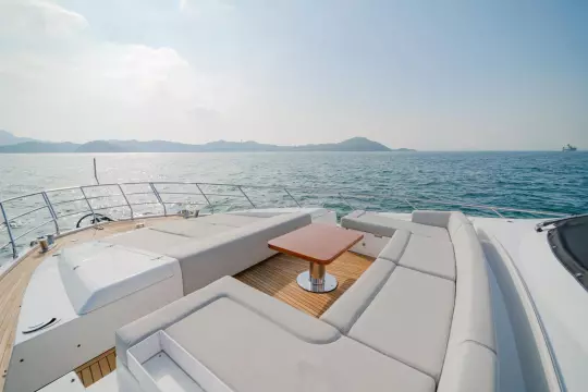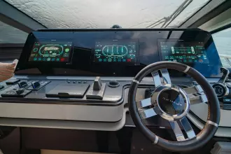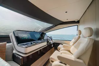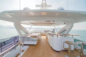 Externally, the yacht boasts an expansive deck area ideal for relaxation and entertainment. The flybridge features a spacious sunbathing area, a wet bar, and dining space, making it perfect for alfresco dining or socializing with family and friends. The aft cockpit offers additional seating and lounging options, while the foredeck is equipped with sunpads for sunbathing and enjoying the ocean breeze.