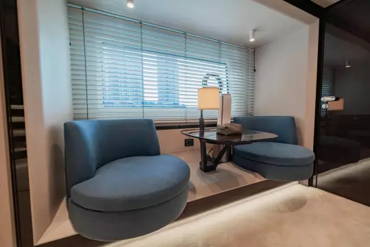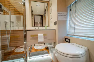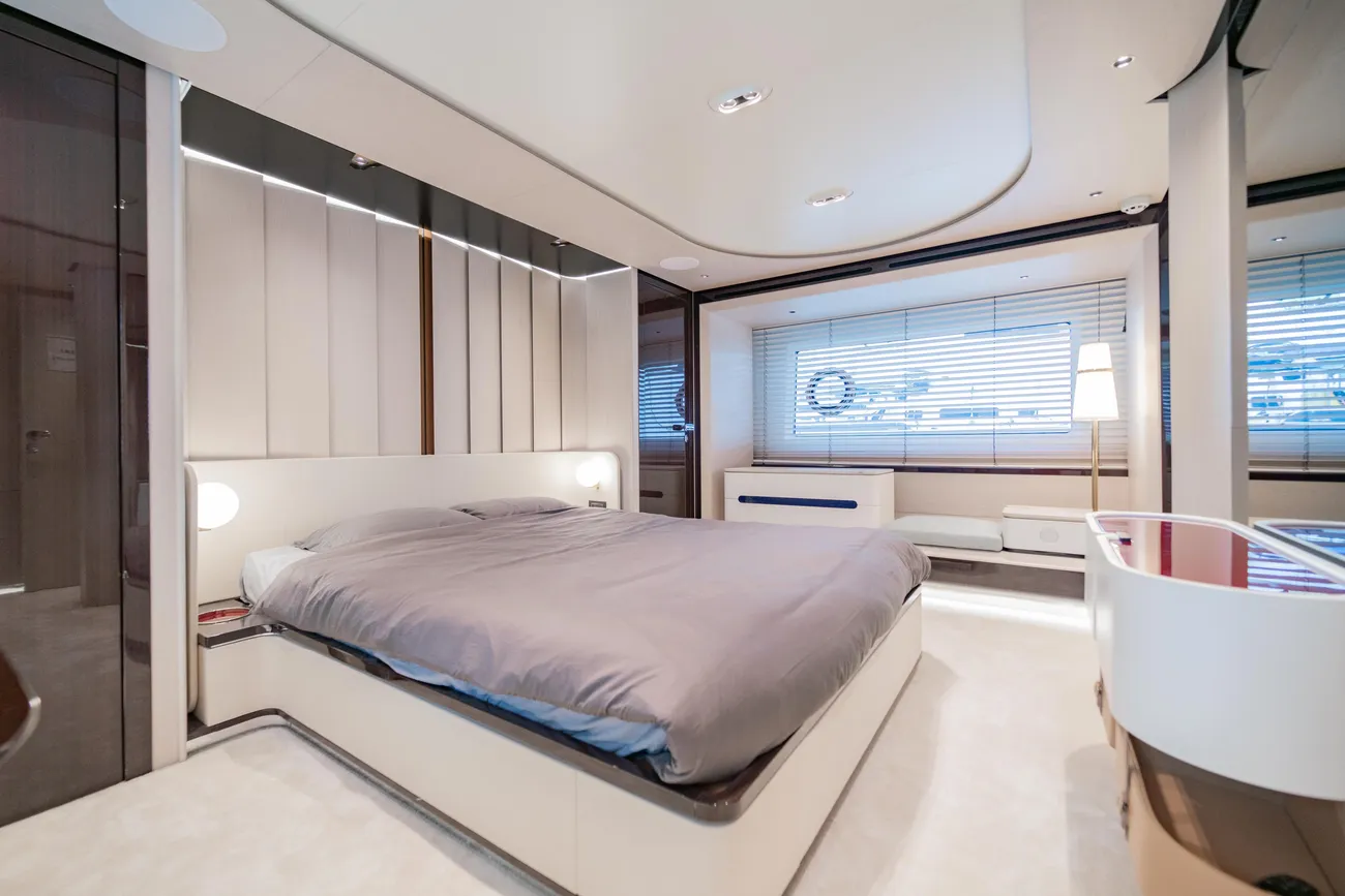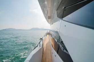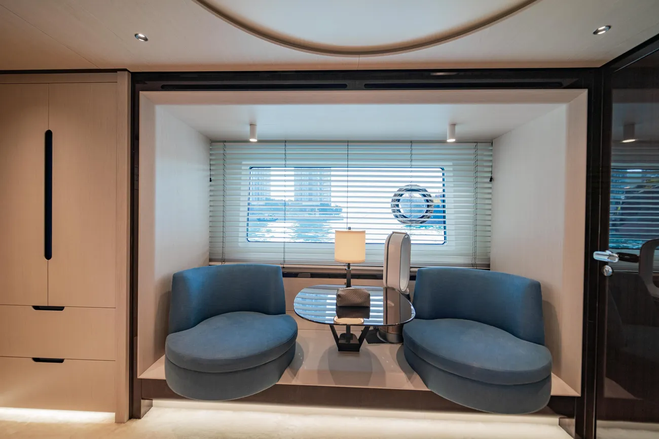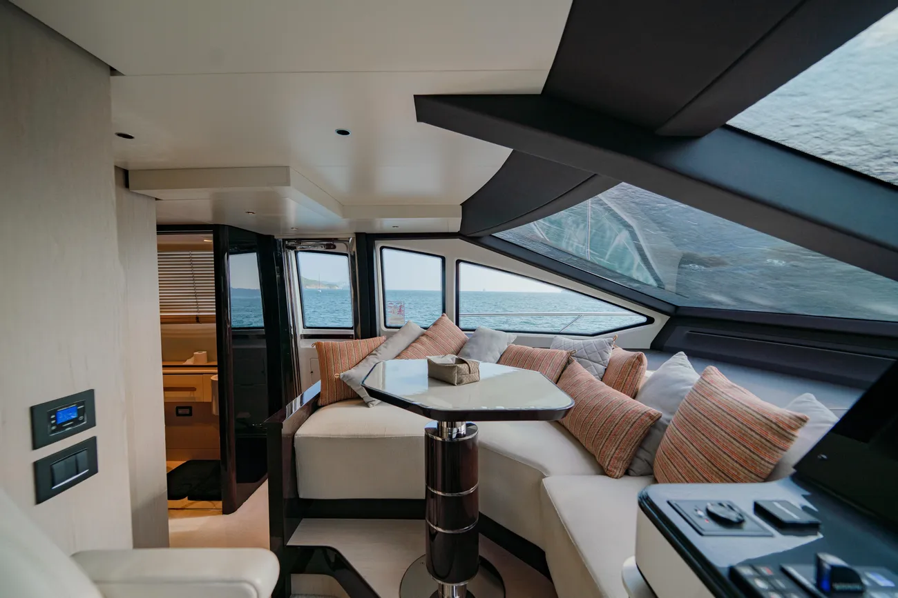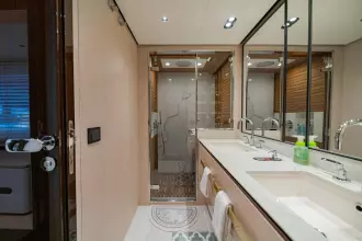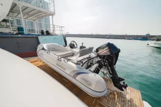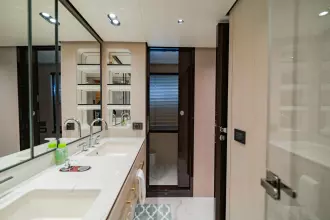 Externally, the yacht boasts an expansive deck area ideal for relaxation and entertainment. The flybridge features a spacious sunbathing area, a wet bar, and dining space, making it perfect for alfresco dining or socializing with family and friends. The aft cockpit offers additional seating and lounging options, while the foredeck is equipped with sunpads for sunbathing and enjoying the ocean breeze.