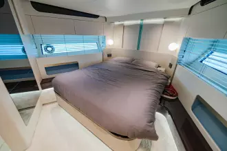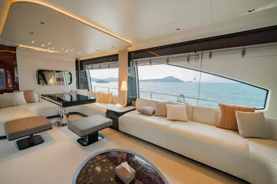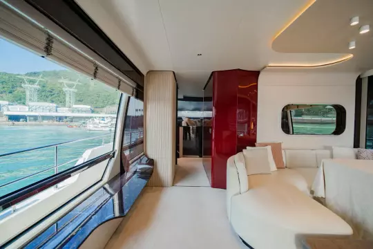 The interior features light cream-colored furnishings complemented by vivid red accents, creating a lively and harmonious atmosphere. The design incorporates bullnose (rounded) corners on walls and pillars, enhancing the yacht's refined and stylish appearance. The spacious saloon provides ample living space, accompanied by a dining area capable of seating eight guests. The four cabins, located on the lower deck, are generously sized ensuite bedrooms that can accommodate a total of nine guests.