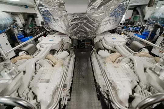 To enhance stability, the yacht is fitted with standard fin stabilizers, and the current owner has additionally installed two QUICK MC2 stabilizers for improved stability during cruising and while anchored.