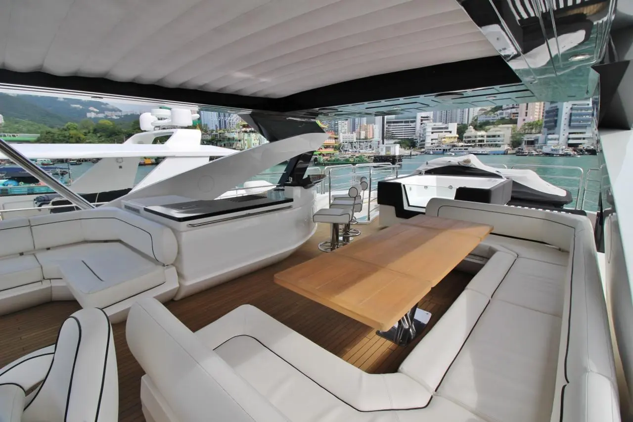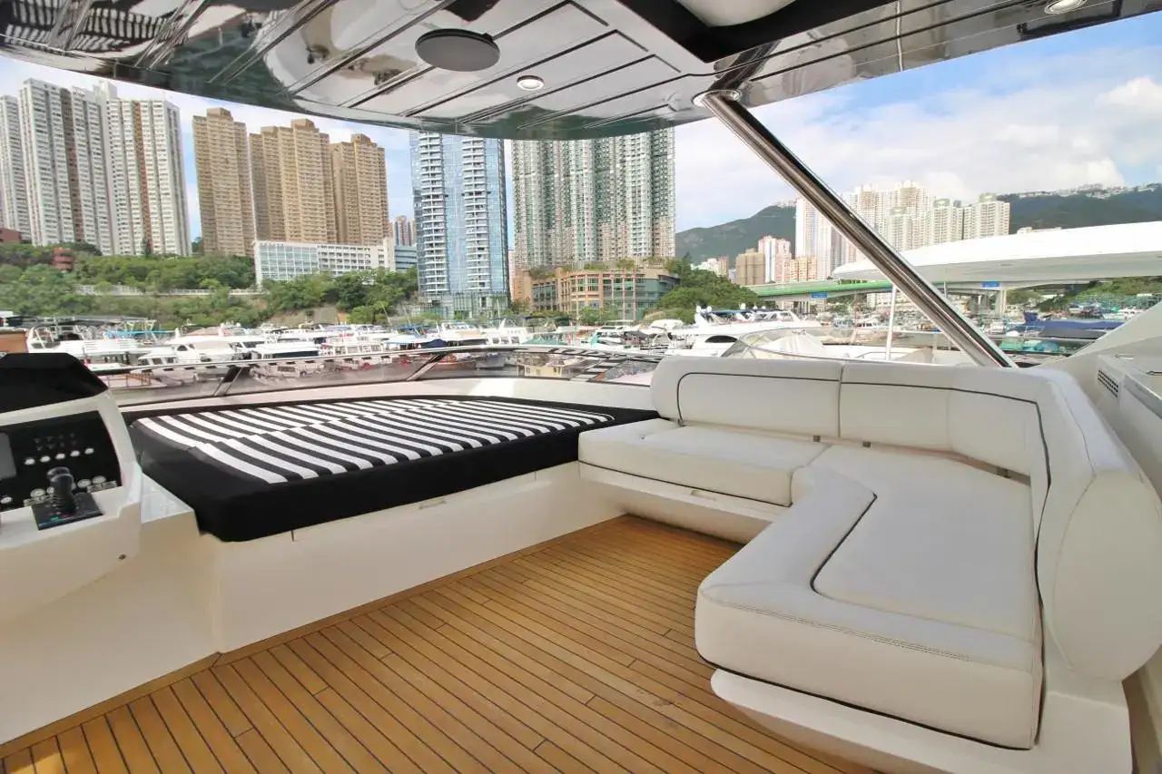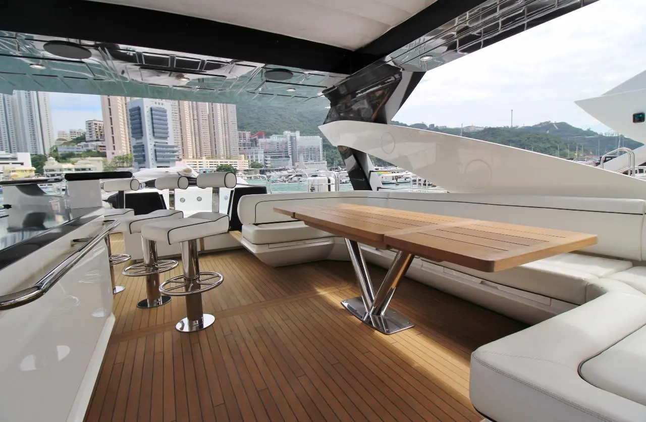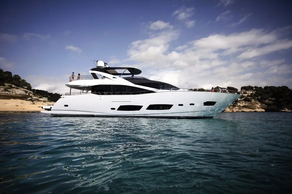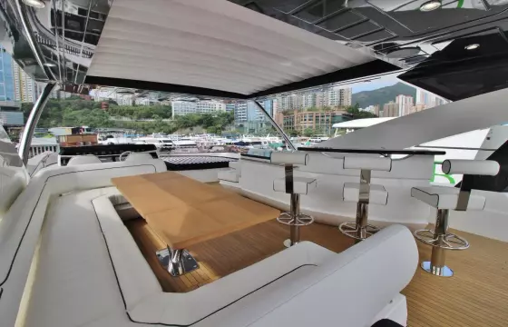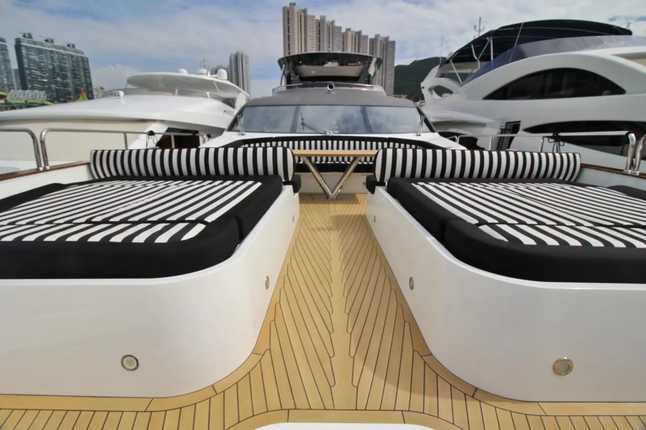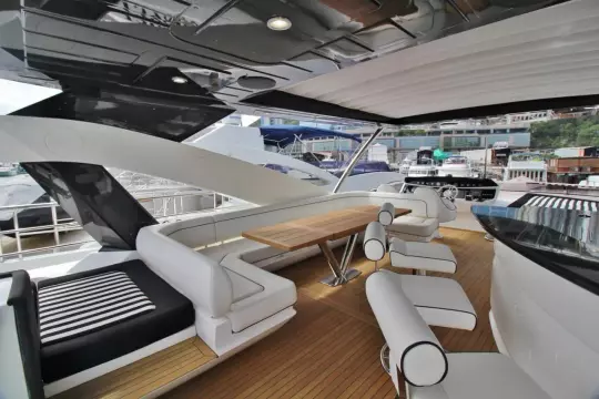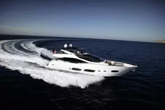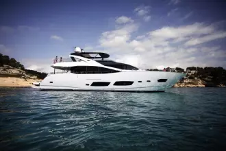 Daring and dramatic. The Sunseeker 28 Metre Yacht will not only thrill but also inspire. Spacious, elegant and practical, the interior is superbly attractive and benefits from exquisite craftsmanship and cutting-edge design. Wraparound glazing and full height windows give you undisrupted panoramic views through an optional drop down saloon balcony, while the dining area benefits from ultra-modern surroundings and clever use of space. On the foredeck, large sunpads and comfortable seating areas are perfect for a little al fresco dining. Alternatively head to the flybridge and enjoy a glass of something cold while cruising along the coastline. True to Sunseeker heritage, this masterpiece of design has been styled to perfection.