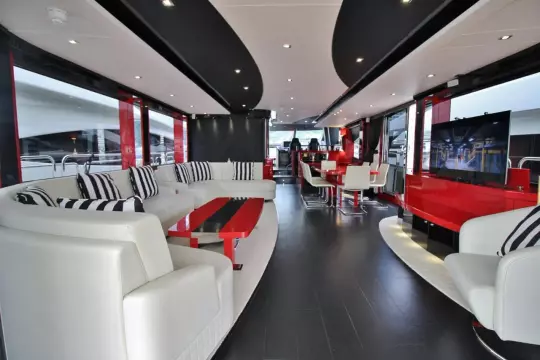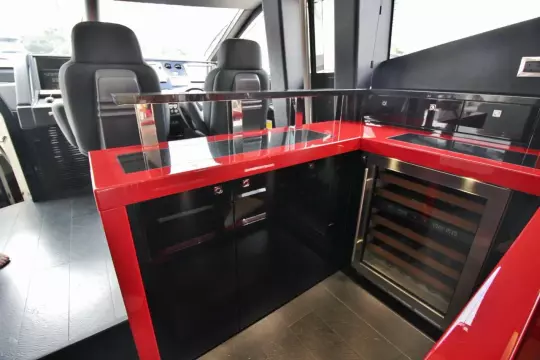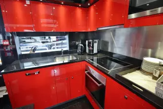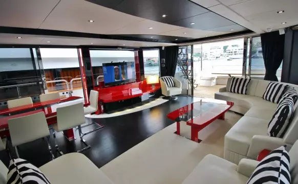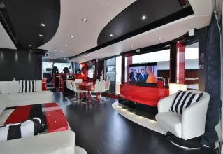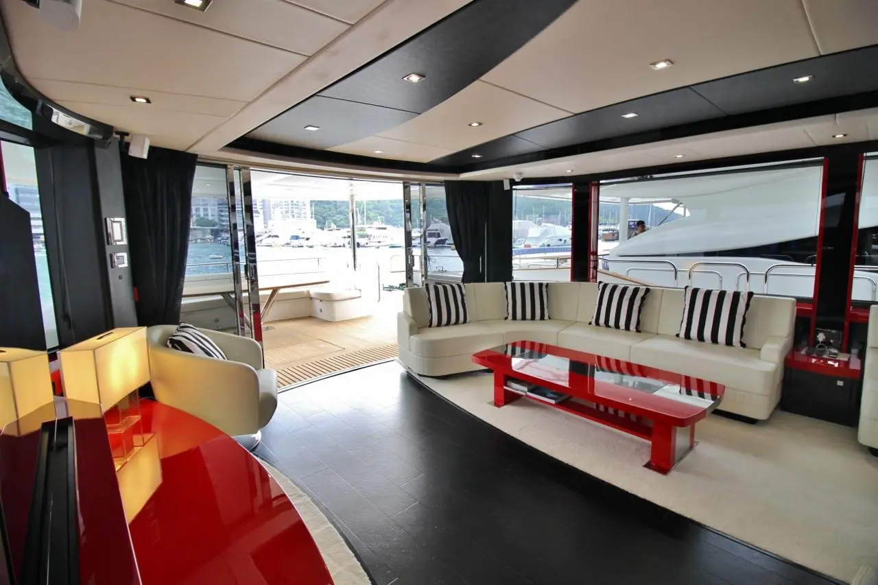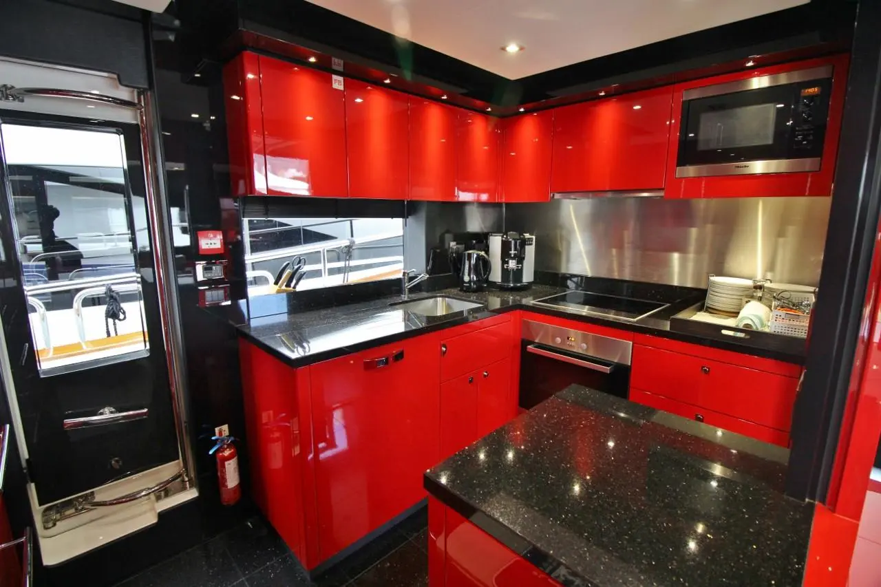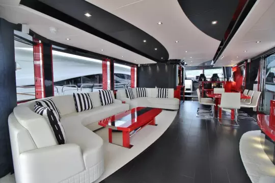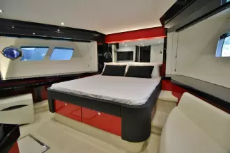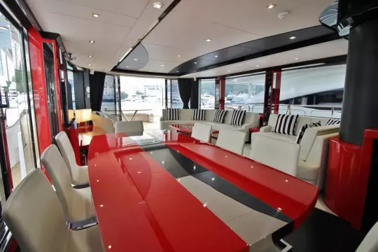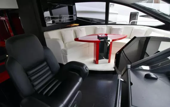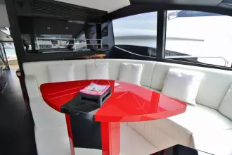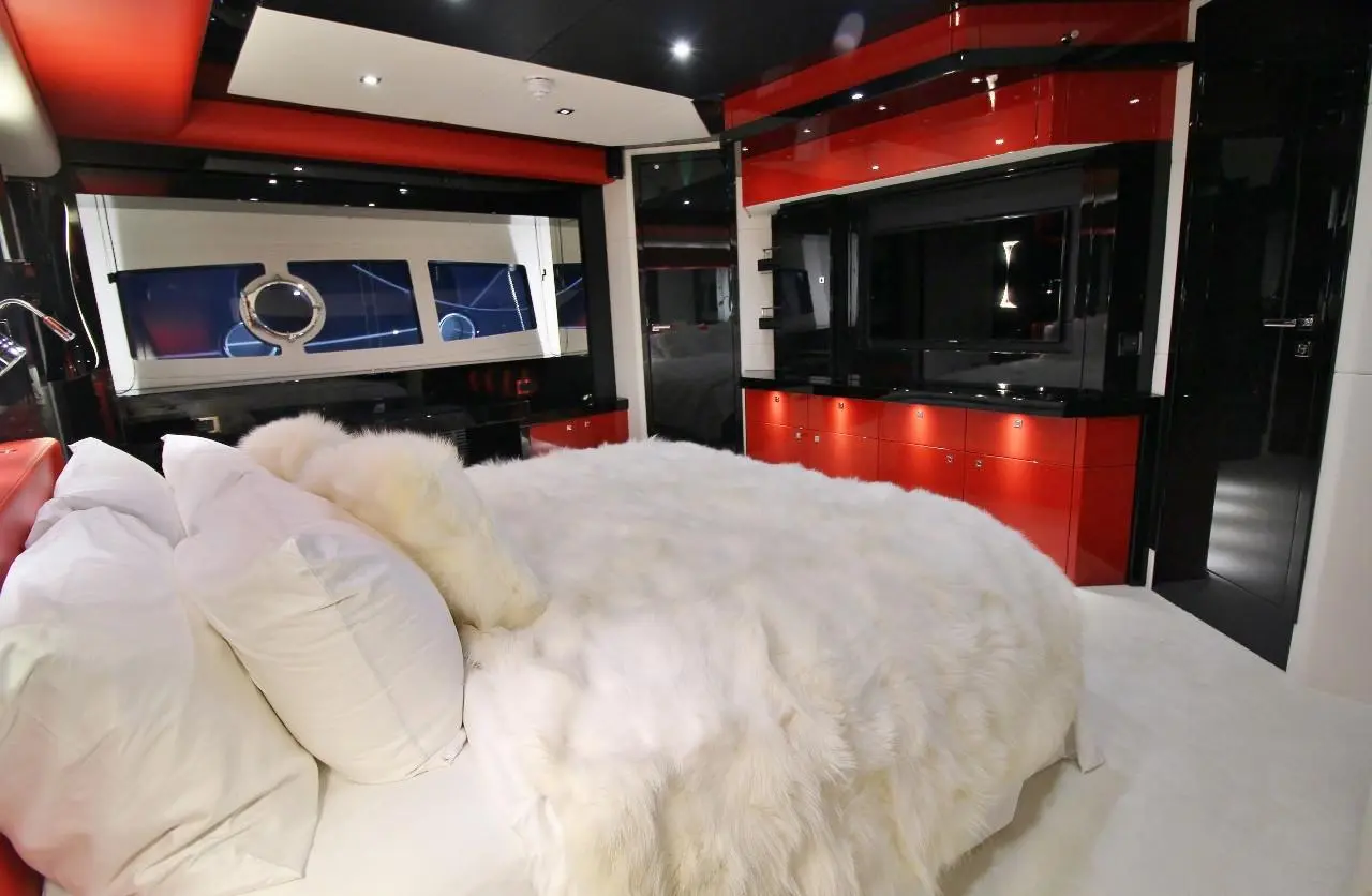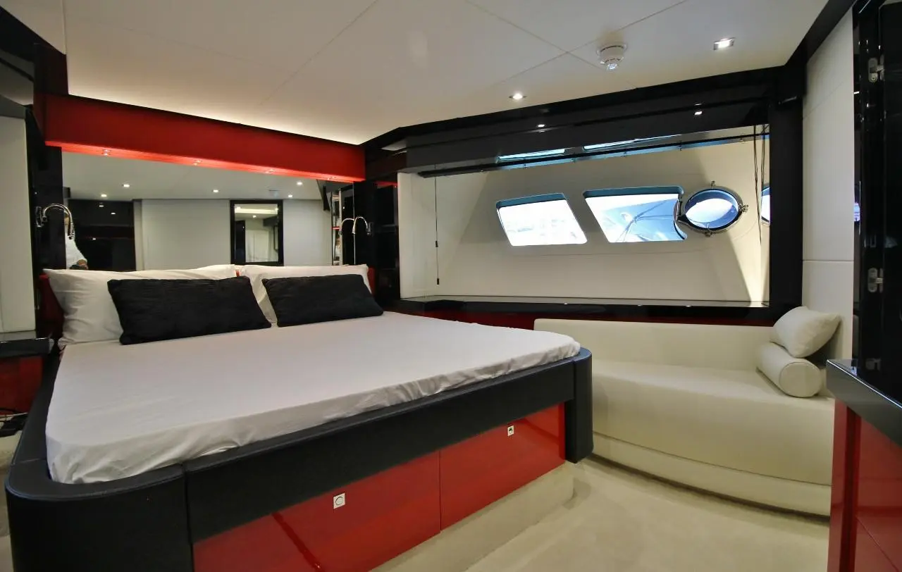 Inside, the Sunseeker 28M features luxurious living spaces adorned with a contemporary design, showcasing high-quality finishes, rich woods, and elegant upholstery. The open-plan layout of the main salon seamlessly integrates the living area, dining space, and galley, creating a spacious and inviting atmosphere. Advanced audio-visual systems enhance the guest experience, ensuring that entertainment is always readily available. Its iconic red and black color scheme is truly unique, setting it apart from similar yachts and reflecting the owner's exceptional taste and aesthetic.