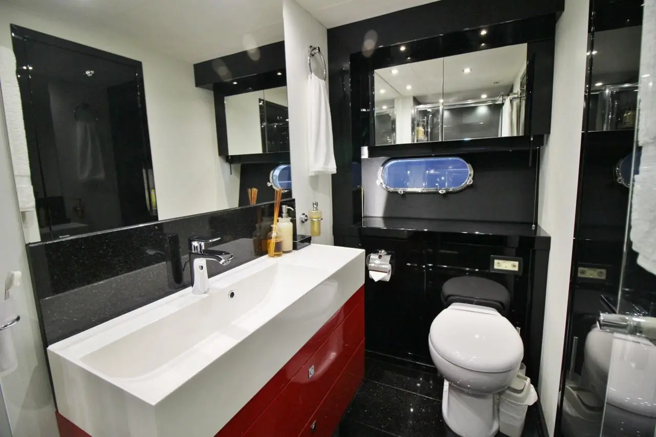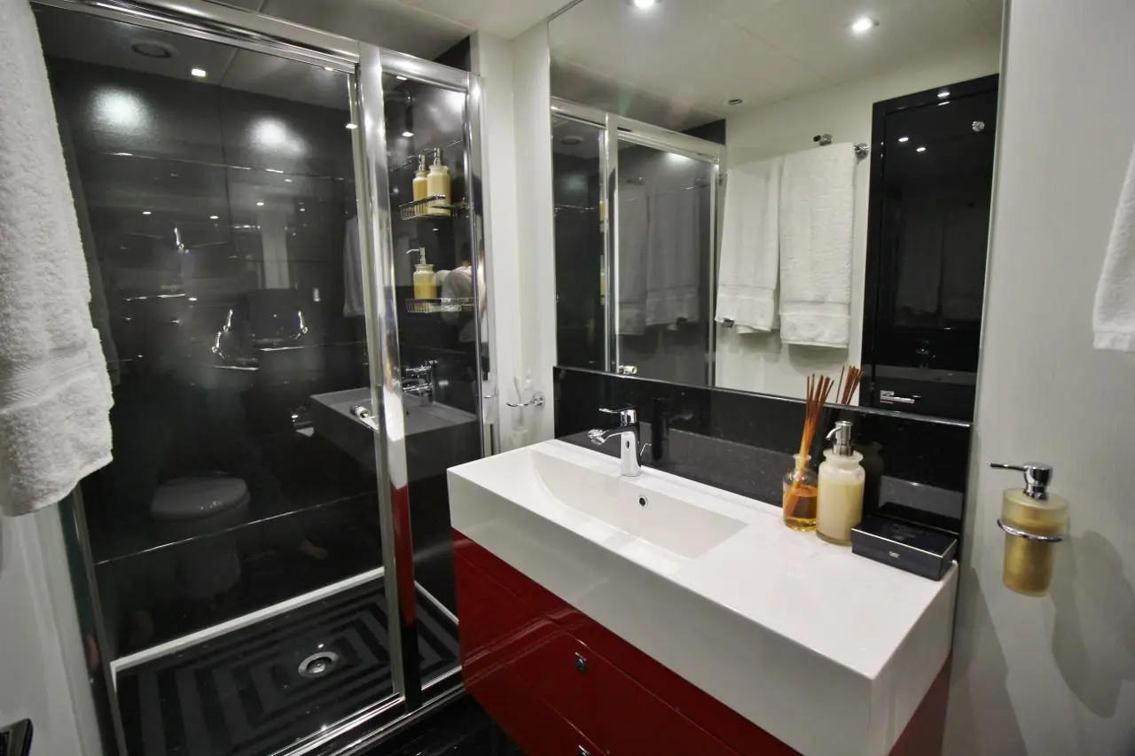 The yacht comfortably accommodates up to eight guests in four beautifully appointed cabins, each featuring en-suite facilities. The master suite serves as a luxurious retreat, complete with large windows that offer natural light and stunning views, along with ample storage and a private bathroom.