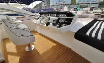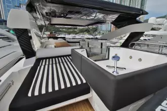 The Sunseeker 28M is a stunning luxury motor yacht that epitomizes elegance and performance on the water. Its sleek lines and sophisticated design create an unparalleled experience for relaxation and entertainment. The exterior features a modern profile that turns heads in any marina, complemented by generous outdoor spaces, including a large sunbathing area, a well-equipped flybridge, and an inviting aft deck perfect for alfresco dining and entertaining. Additionally, the yacht is equipped with a hydraulic swim platform, allowing easy access to the water for swimming and water sports.