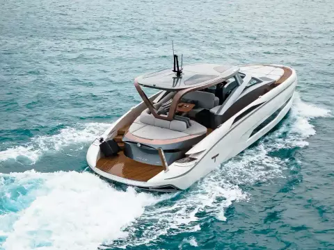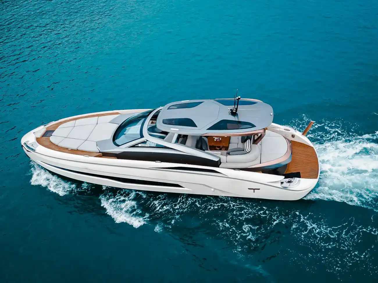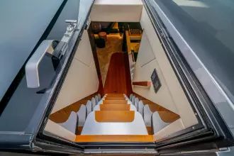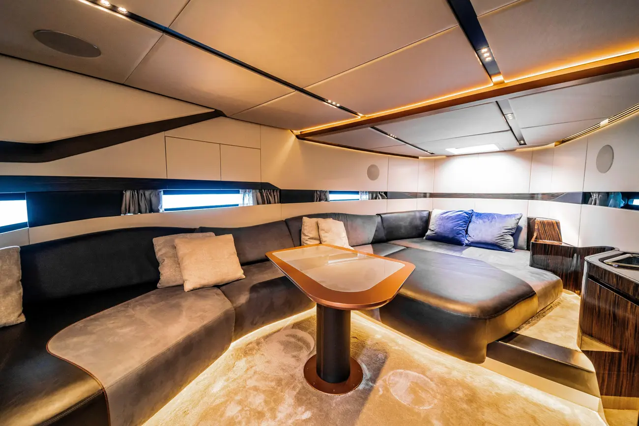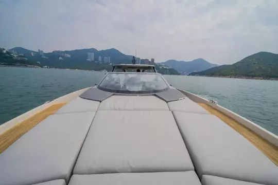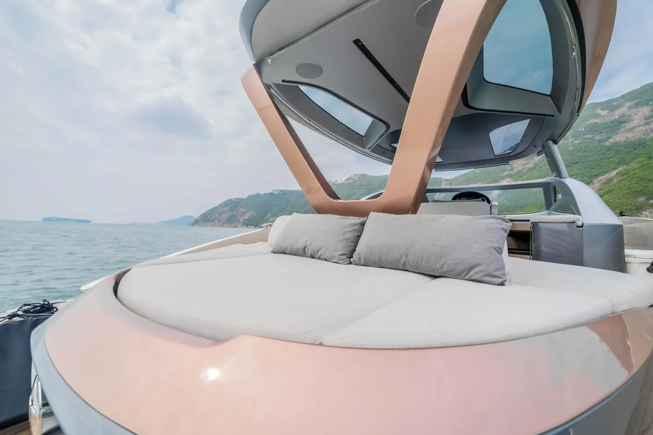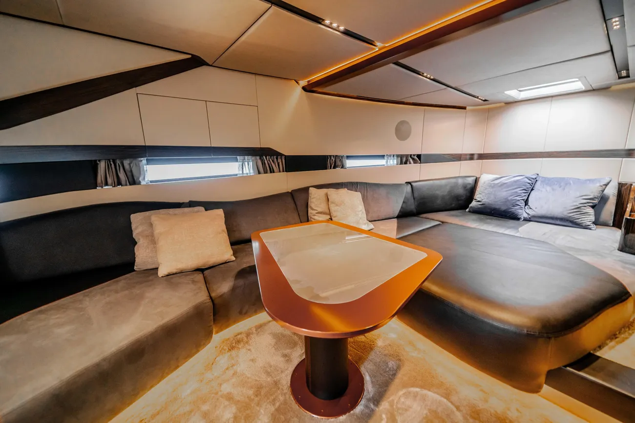 The Tecnomar 55 evo offers expansive areas dedicated to navigation, relaxation, and sunbathing. The forward deck is equipped with cushions, providing a sunbathing space typically found on larger yachts. The design is striking and unique. The Evo 55's design will remain easily recognizable and set new trends in the industry; its exterior design deviates from conventional styles, featuring extensive use of LED lights along the yacht, following modern automotive principles. This creates a visual spectacle at night, complemented by sculptural details like the custom stemhead, making this yacht unparalleled.