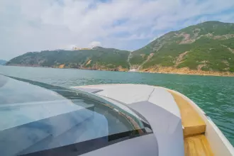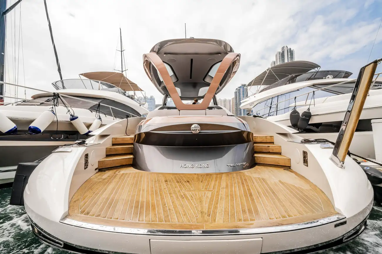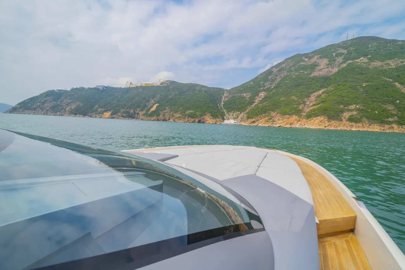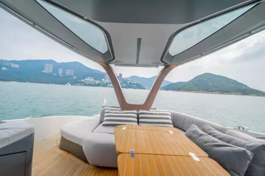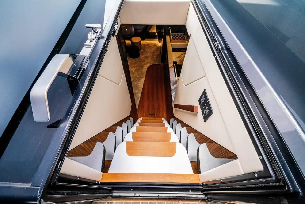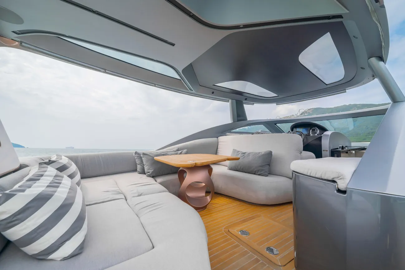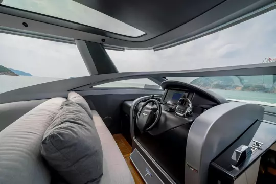 The Tecnomar 55 evo offers expansive areas dedicated to navigation, relaxation, and sunbathing. The forward deck is equipped with cushions, providing a sunbathing space typically found on larger yachts. The design is striking and unique. The Evo 55's design will remain easily recognizable and set new trends in the industry; its exterior design deviates from conventional styles, featuring extensive use of LED lights along the yacht, following modern automotive principles. This creates a visual spectacle at night, complemented by sculptural details like the custom stemhead, making this yacht unparalleled.