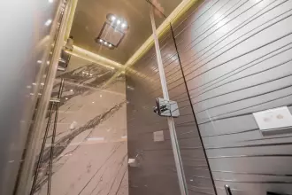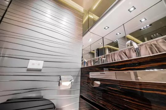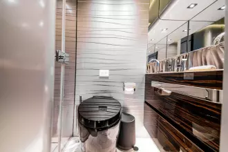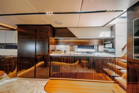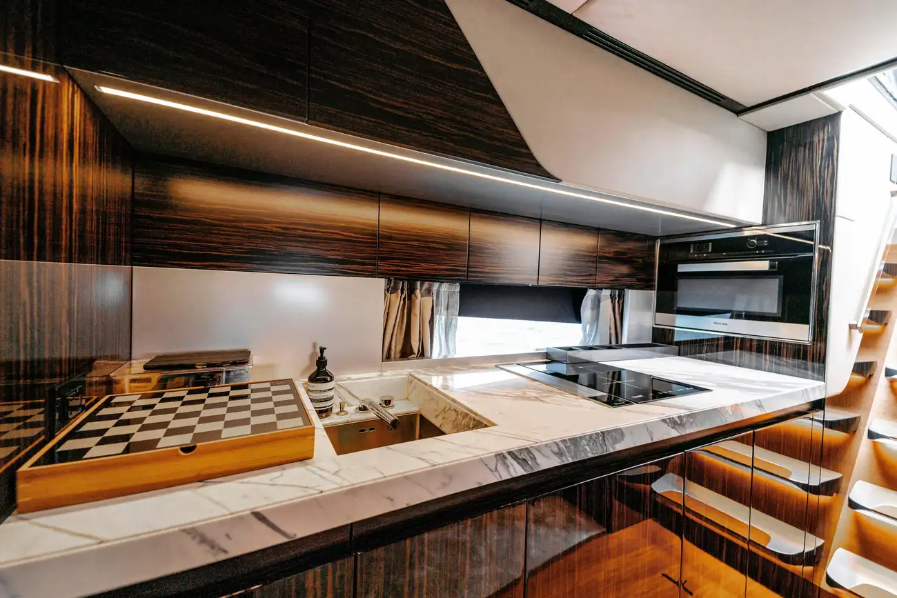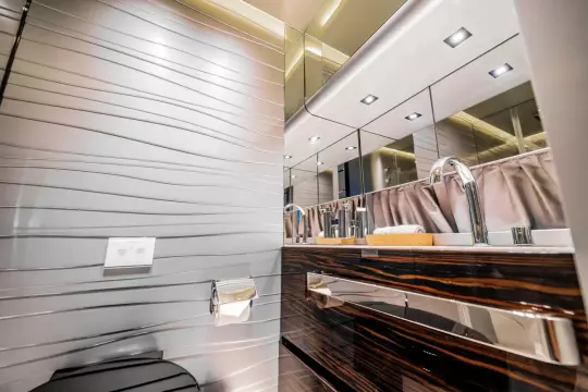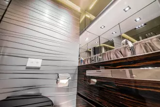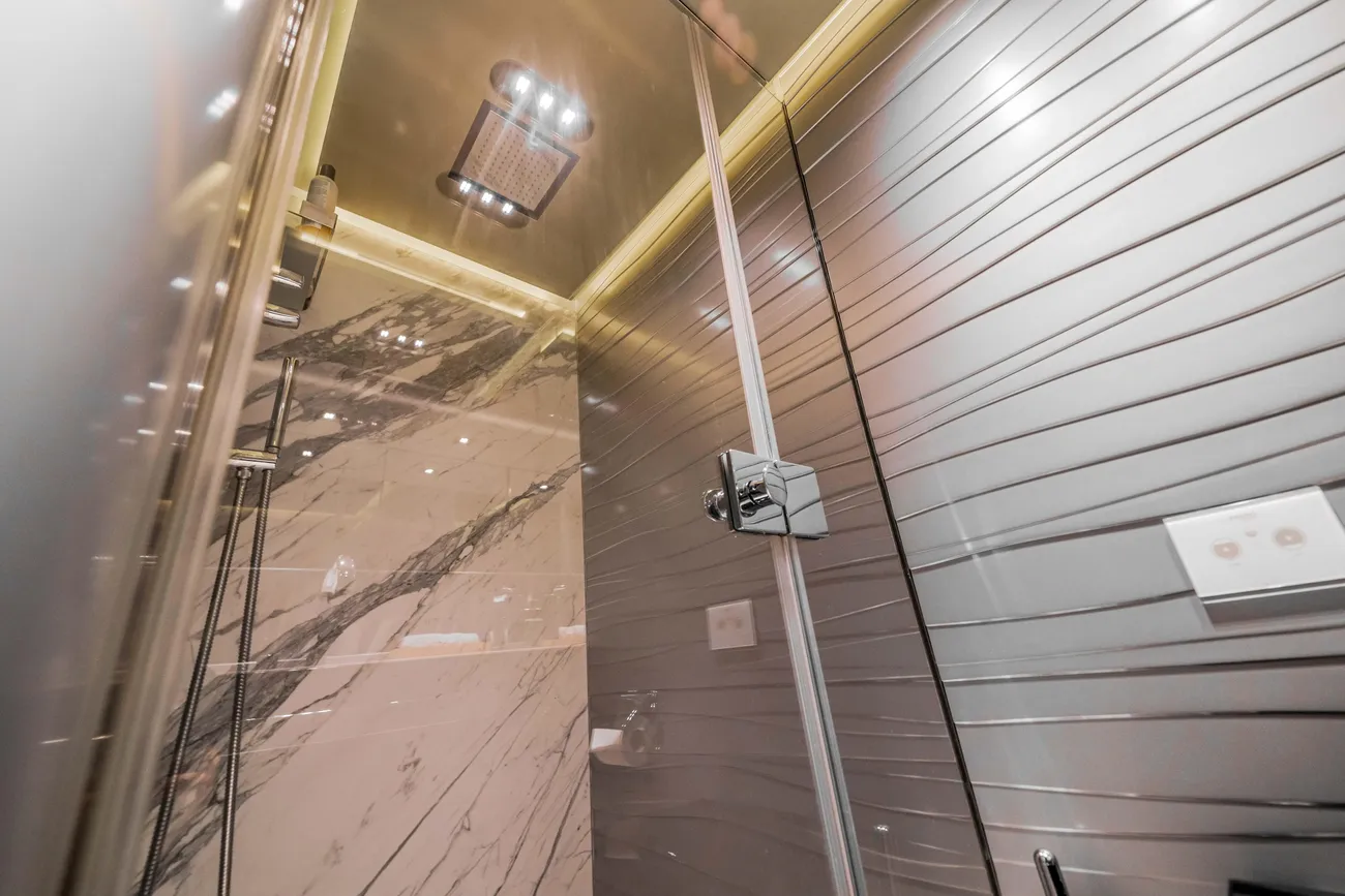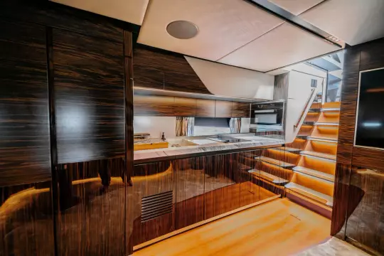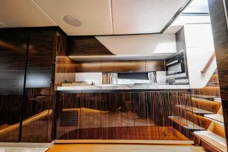 The same design philosophy continues below deck, where the luxury typically found in superyachts is evident. M/Y Vesuv features an interior layout with a master cabin forward (with ensuite bathroom) and a convertible lounge (also with ensuite bathroom), which can be completely separated from the galley located on the starboard side. The interiors showcase subtle details and high-quality materials, creating a unique and hard-to-match ambiance.