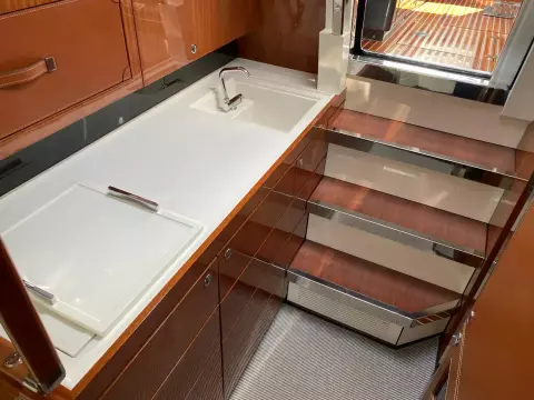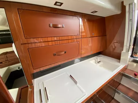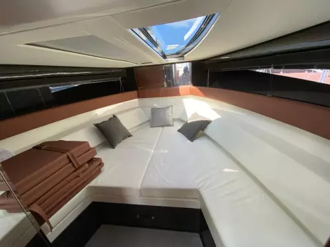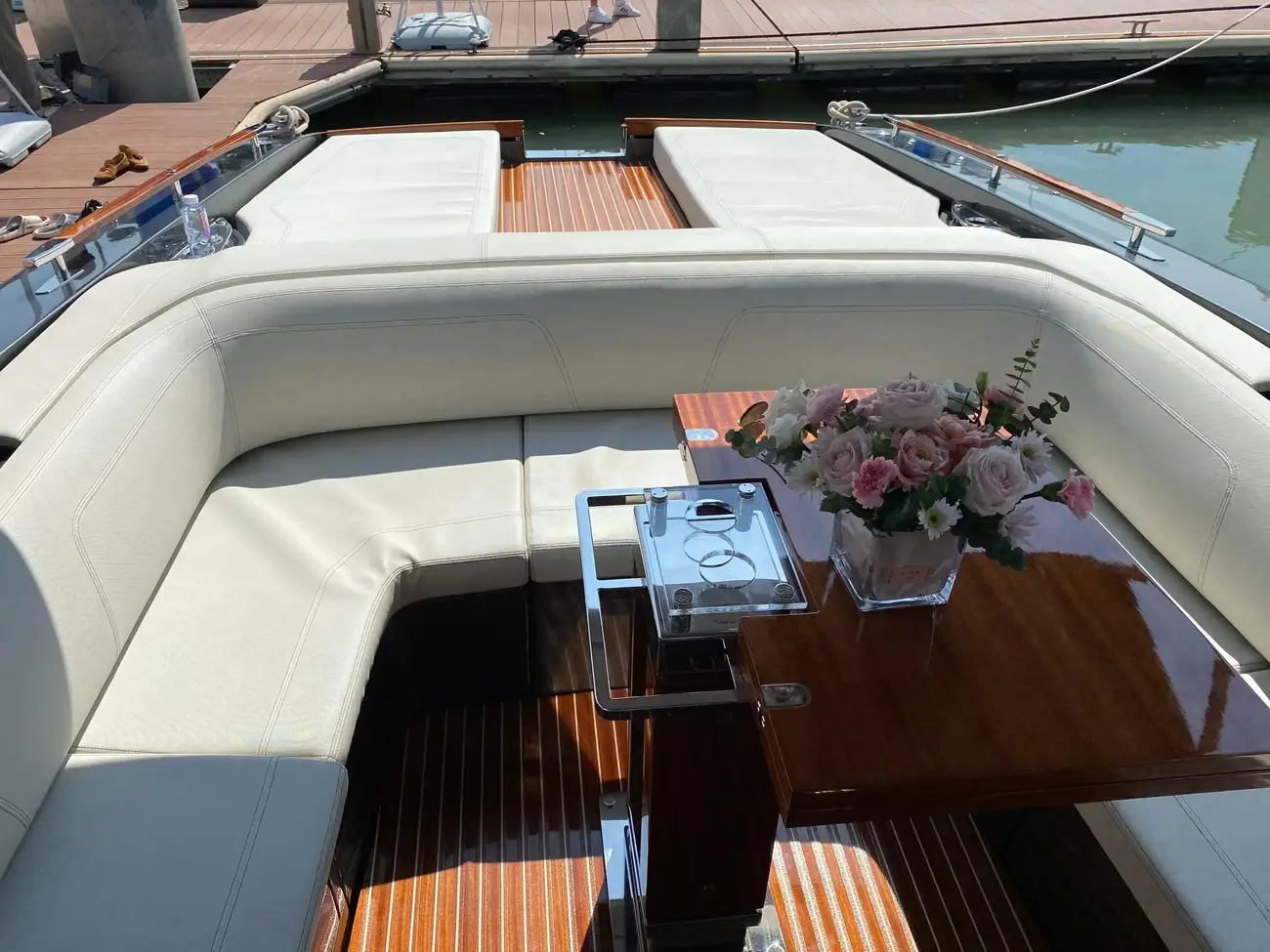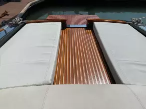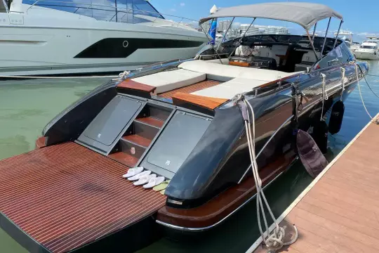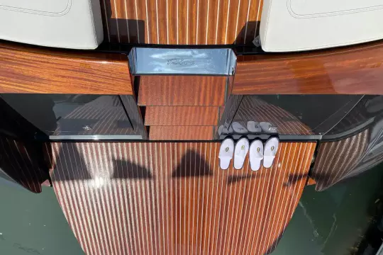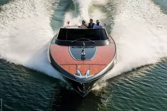 The Rivamare boasts a sporty silhouette while retaining Riva’s timeless elegance. Handcrafted mahogany paneling graces the front of the boat. Inside, you’ll find premium seating, sundecks, a kitchen, a shower, and a living area. She can cruises at a comfortable speed of 31 knots and can reach a thrilling top speed of 40 knots.