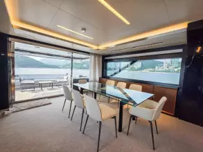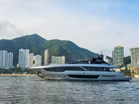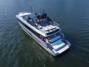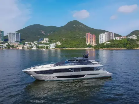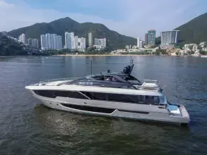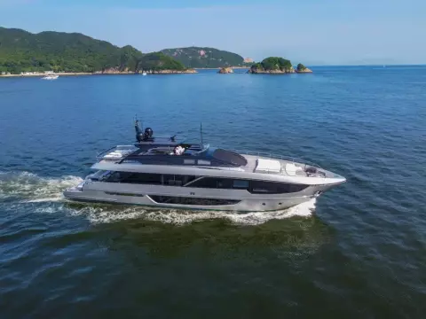 The 2024 Riva 102' Corsaro Super is a luxury flybridge motor yacht known for its blend of elegance, power, and cutting-edge technology. It features a sleek, contemporary design with a sporty silhouette and a focus on maximizing space and interaction with the sea. The yacht offers a choice of engine configurations, delivering a top speed of up to 28 knots and a cruising speed of 24 knots. Inside, the yacht boasts a spacious salon, a dining area, and a master suite with a forward terrace, all designed with custom finishes and bespoke furnishings.