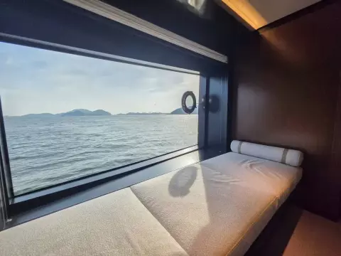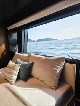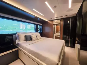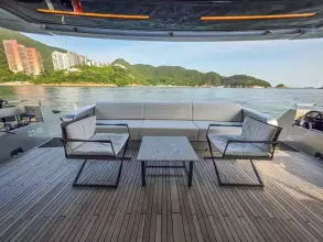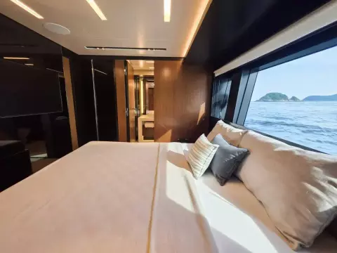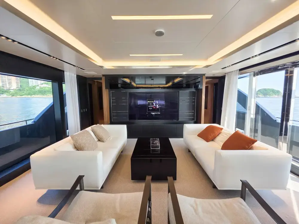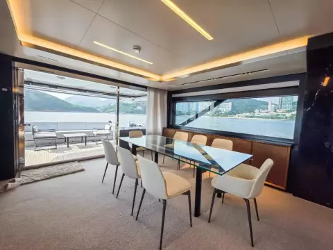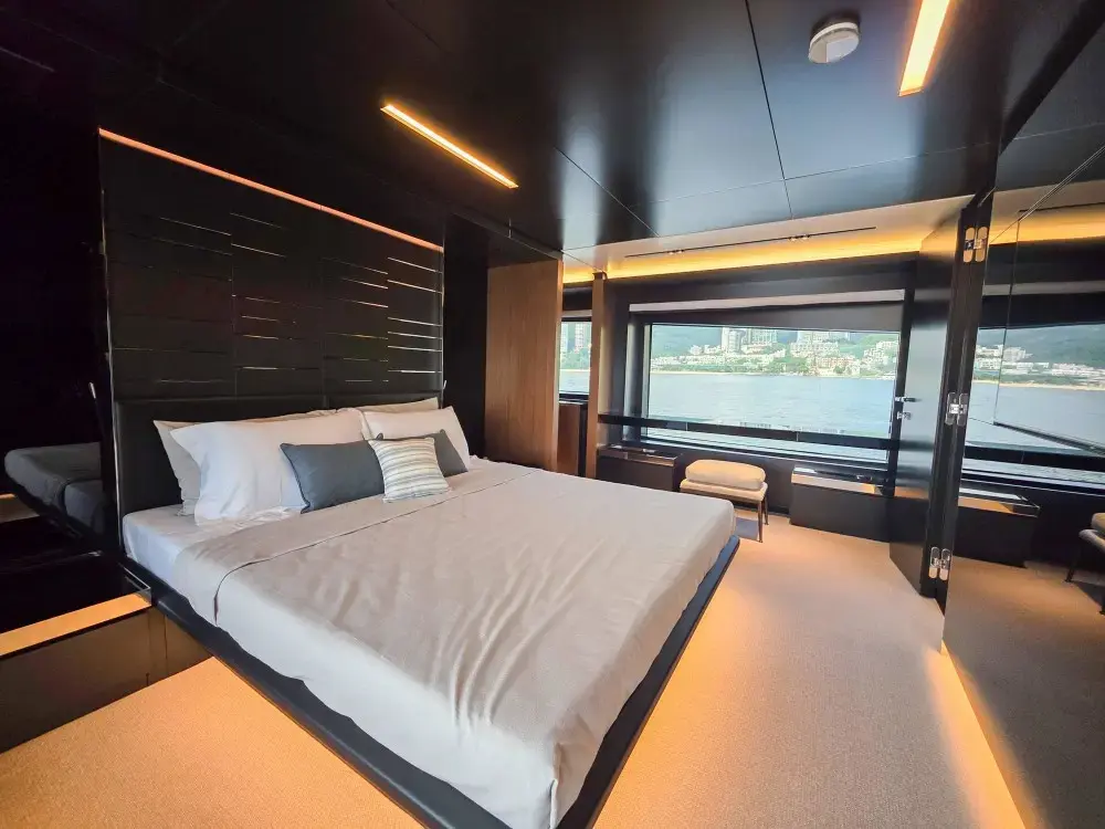 Expansive indoor and outdoor lounges, a large aft deck, and a private master suite.