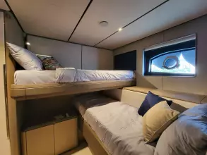 Below deck, the yacht is equipped with four guest cabins, including a spacious amidships master cabin. In addition to the master cabin, there are three ensuite cabins on the lower deck, offering comfortable overnight accommodation for up to eight guests. The yacht also has space for three crew members.