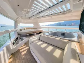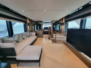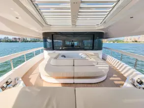 The Ferretti INFYNITO 90 features an enclosed upper deck sky lounge, surrounded by expansive glazing that offers panoramic views and a direct connection to the upper deck cockpit. This sky lounge not only provides magnificent views but also ensures a comfortable and luxurious experience. With no boundaries, the view extends far and wide, merging the boat and horizon on the spectacular All-Season Terrace. The bow is an enclosed haven with a covered roof and strategically placed cut-outs, inviting expansive views, fresh sea breezes, and total privacy. This is truly a paradise on board, offering a stunning private experience year-round.