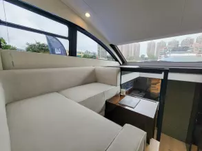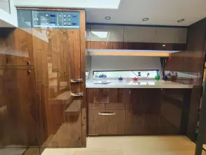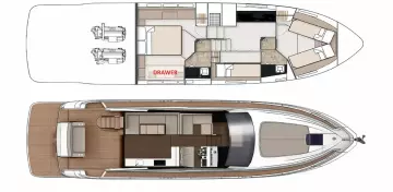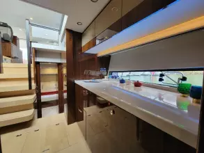 This example has the preferred three cabin layout with the upgraded galley up configuration allowing plenty of accommodation and the added bonus of the social galley up layout. Benefiting from a host of options including a hydraulic high/low platform, air conditioning, Seakeeper gyroscopic stabiliser, Humphree interceptors, dynamic positioning system and the Squadron premium pack.