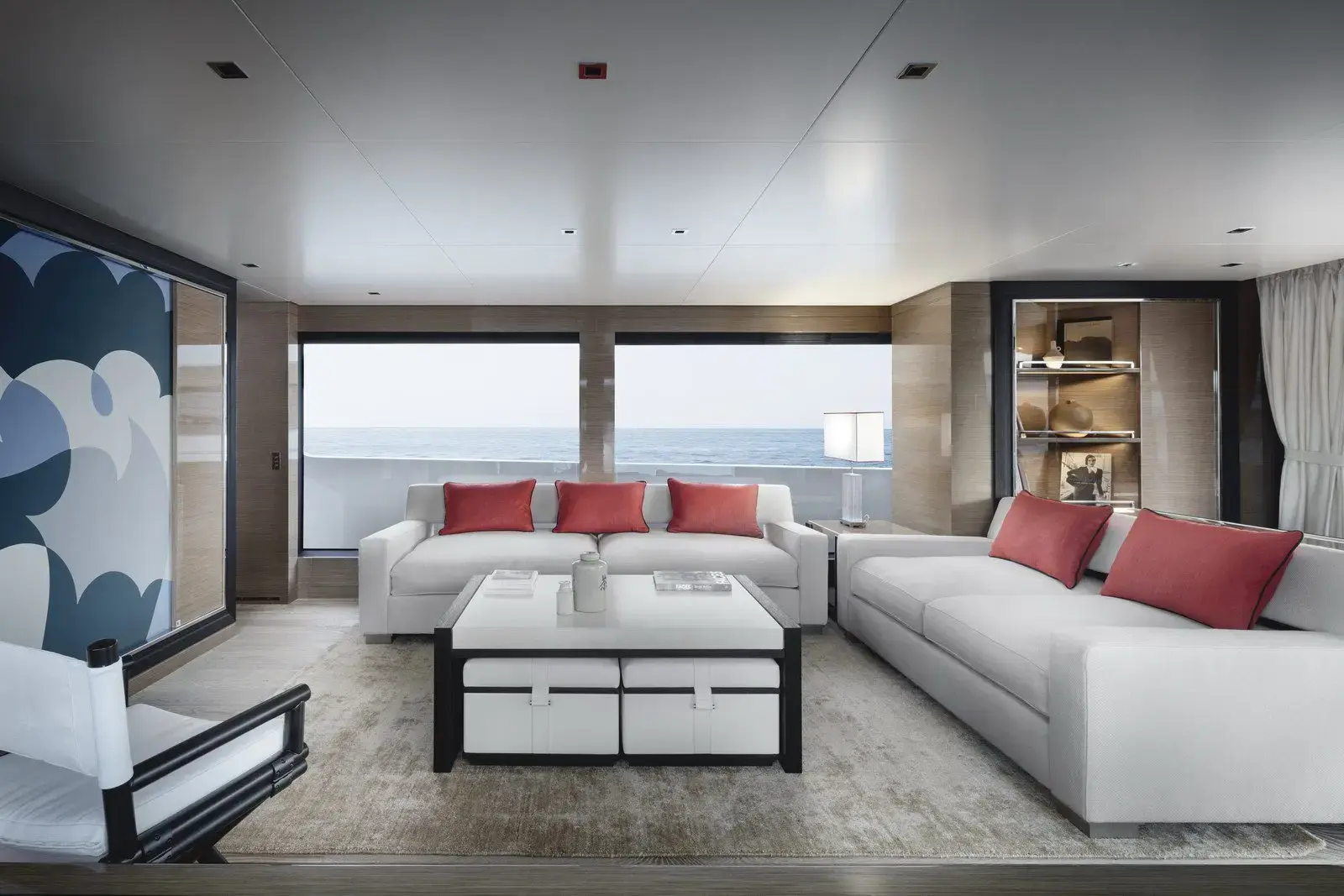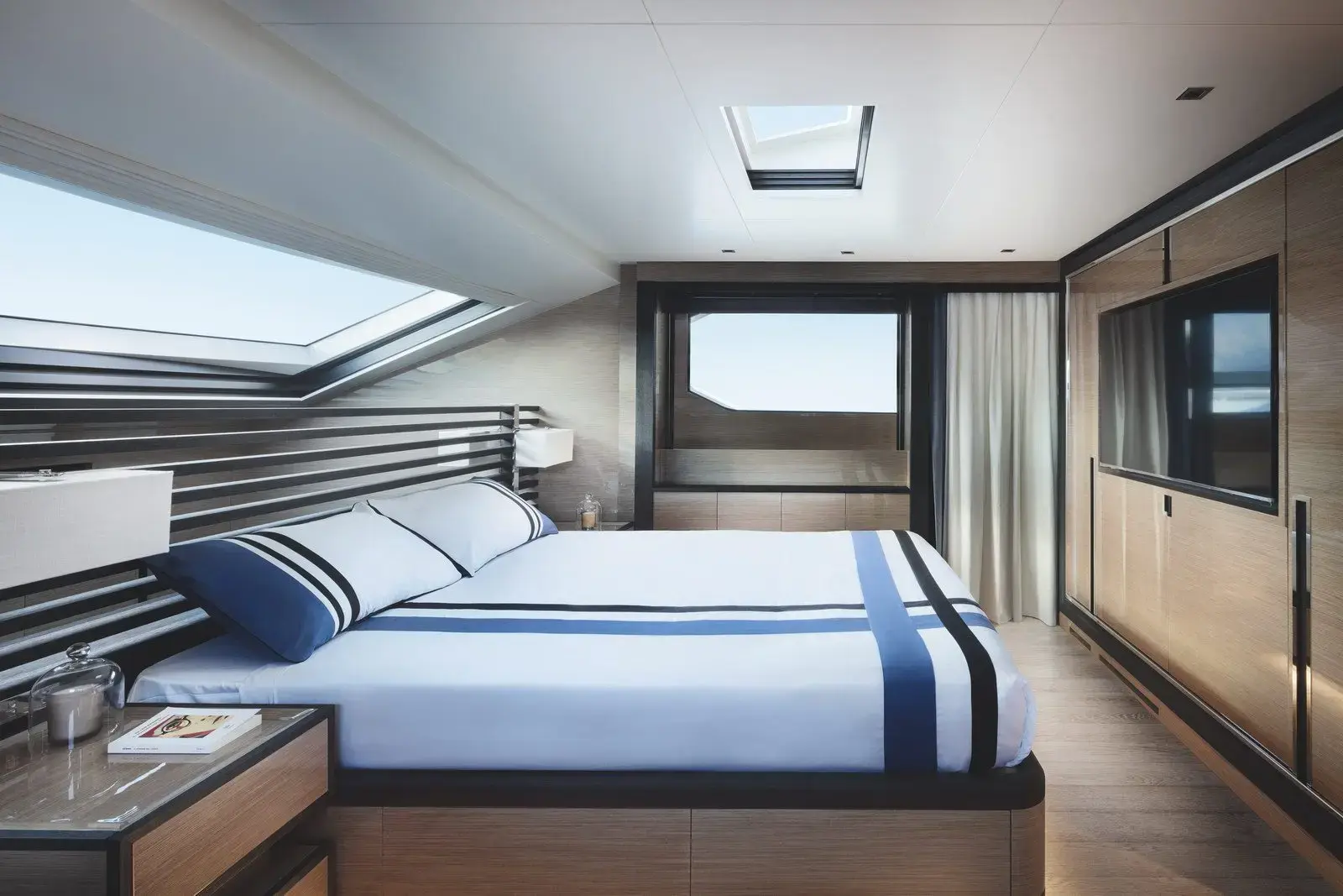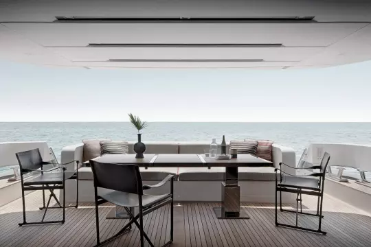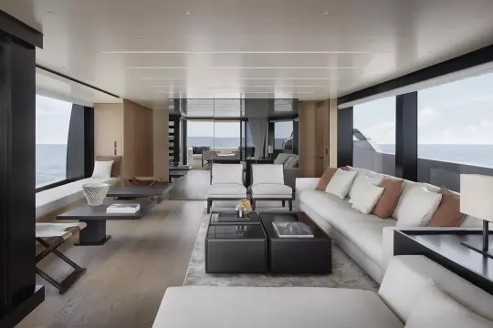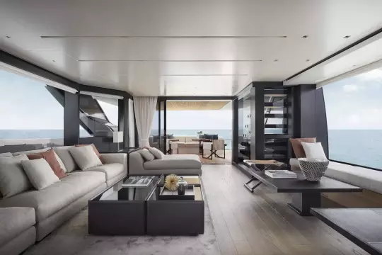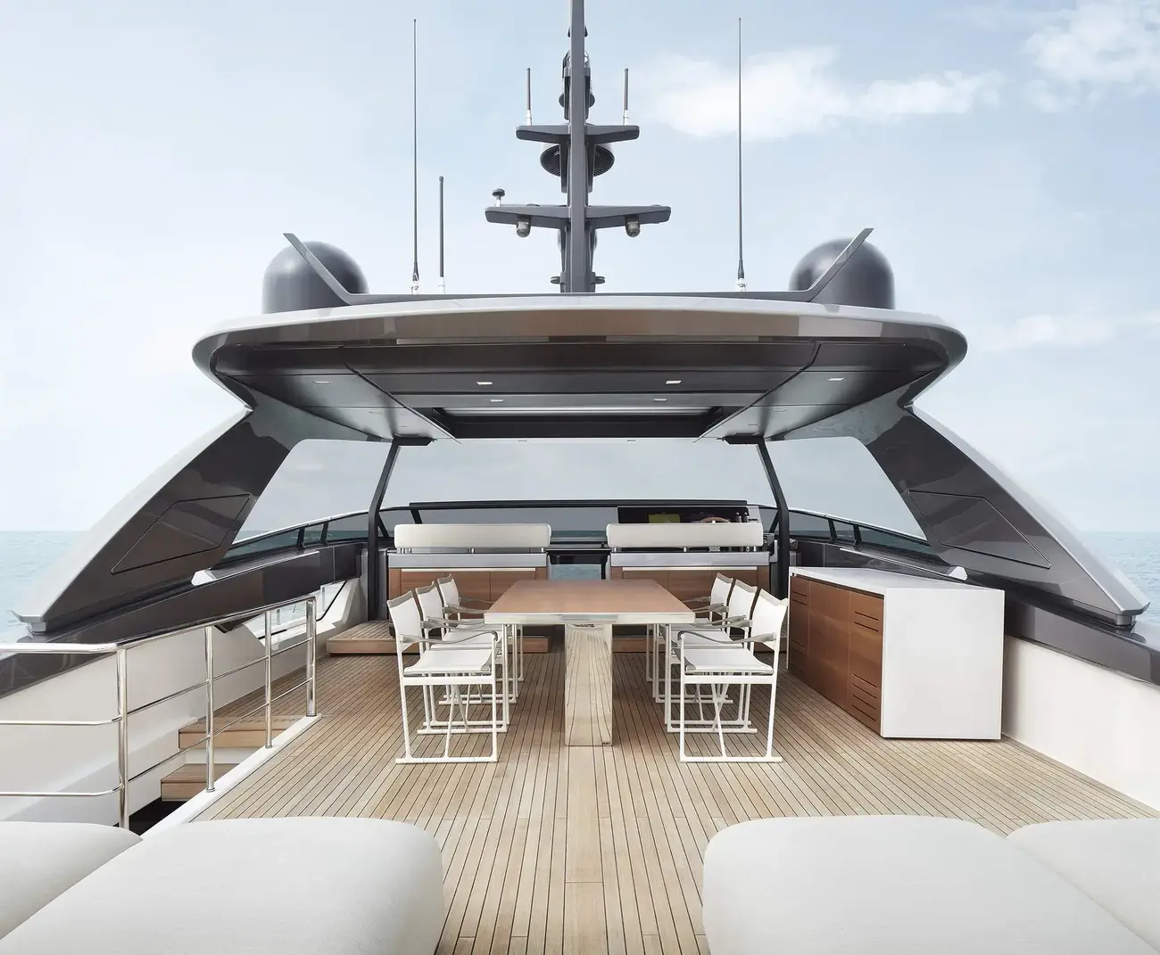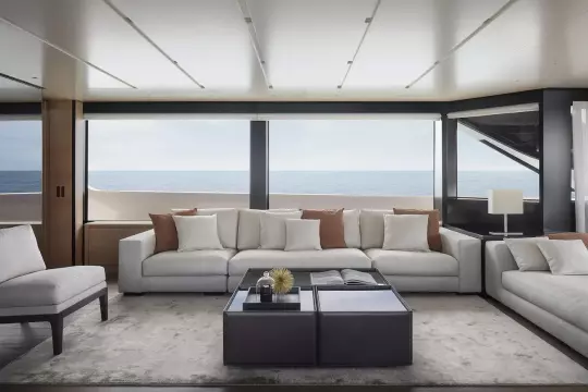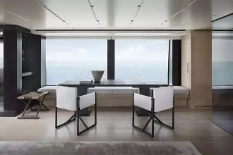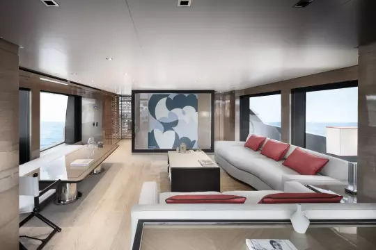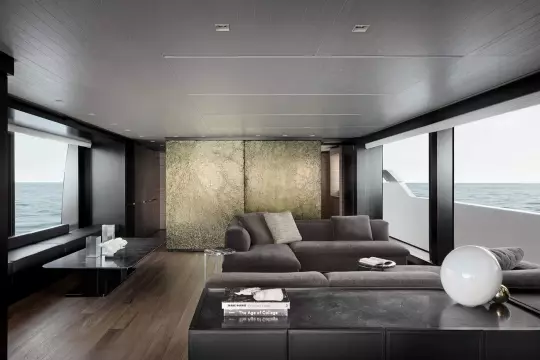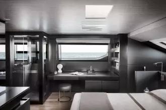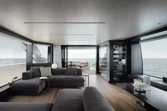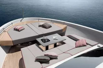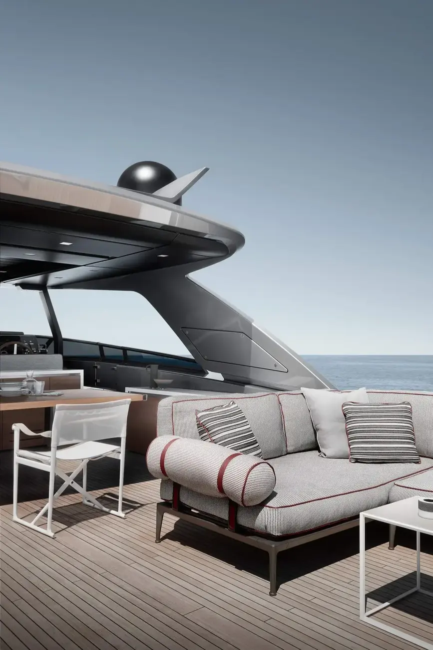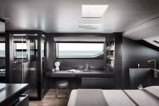 With the aim of making more use of the interior spaces and having better communication with the outside world, SL96Asymmetric rethinks the canonical layout of a yacht, retaining only the side decks on the starboard side and eliminating the portside one, which is carried on the roof of the superstructure, allowing 10sqm of surface space to be recovered to the benefit of the interiors, through this asymmetric configuration. Something which has never been tried before.