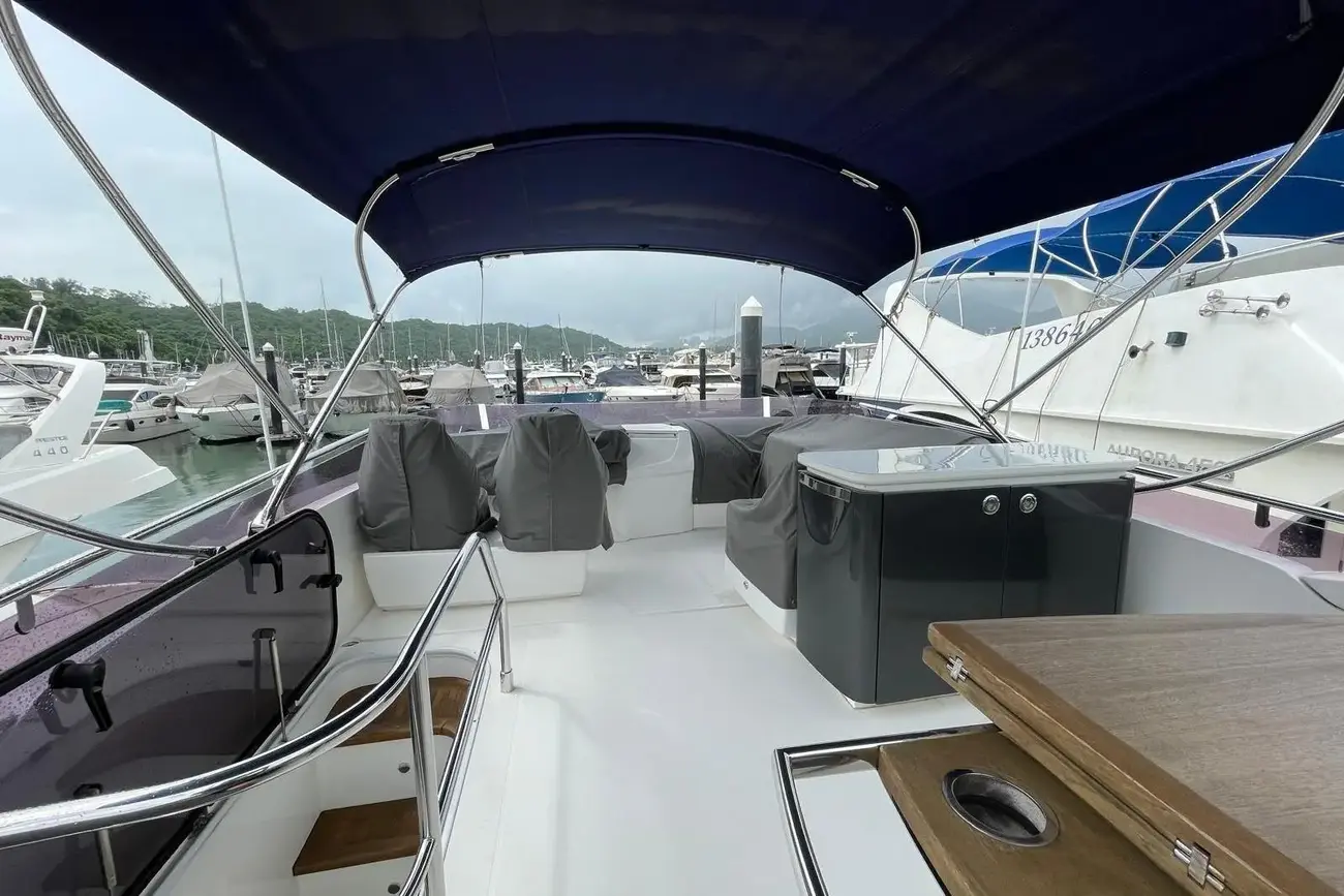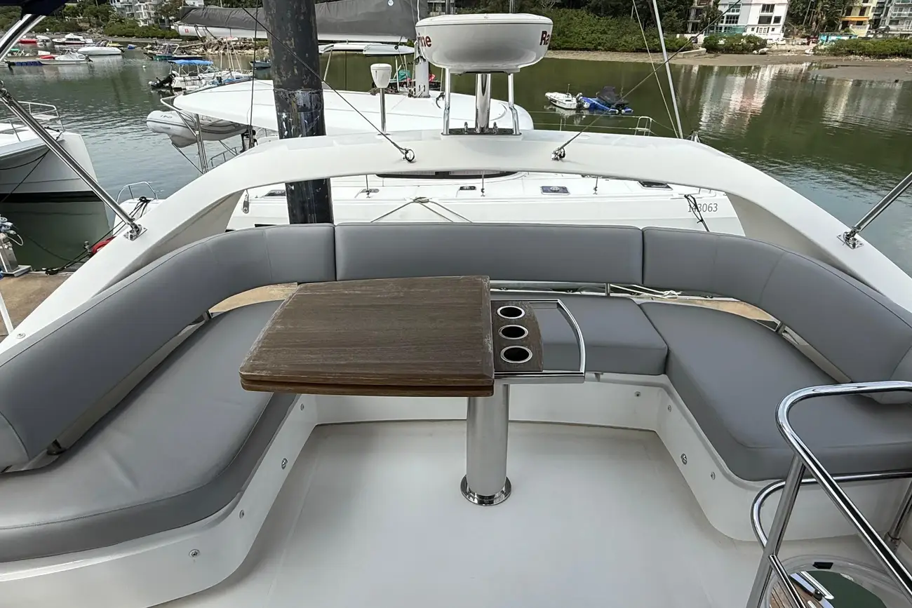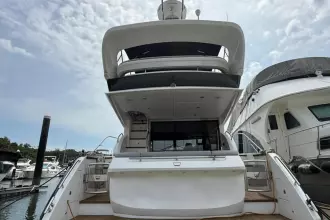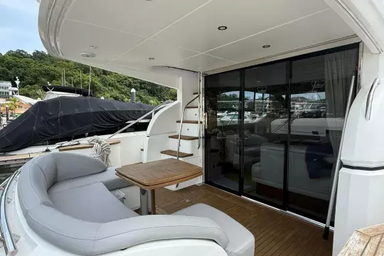 - Teak-laid transom platform, cockpit deck, flybridge stairway and stairs to side decks