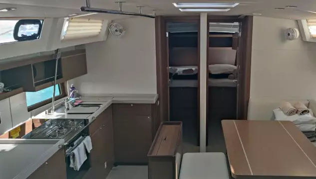 - Saloon with U-shaped saloon settee and table that can be lowered (extra sleep)