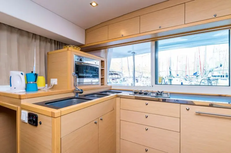 The fully-equipped galley includes a fridge, oven, cooker, sink and kitchen utensils.