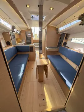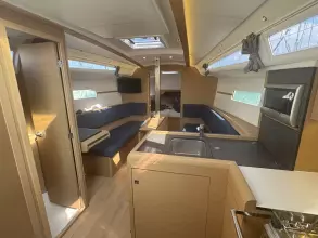 2019 Sun Odyssey 349 standard keel, 2 cabins/1 head version, upgraded Grey Cedar interior and navy upholstery. Light floor. Great specification including diesel heating, full suite of electronics, aft platform, cockpit cushions and bowsprit inc asymetric sail. Option of controls lead aft to the steering position for shorthanded sailing or lead to winches fitted under sprayhood for crewed sailing.