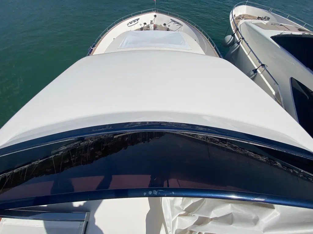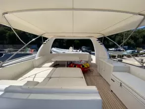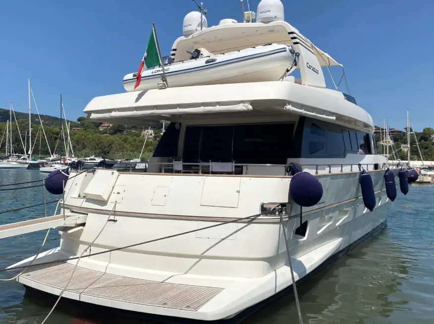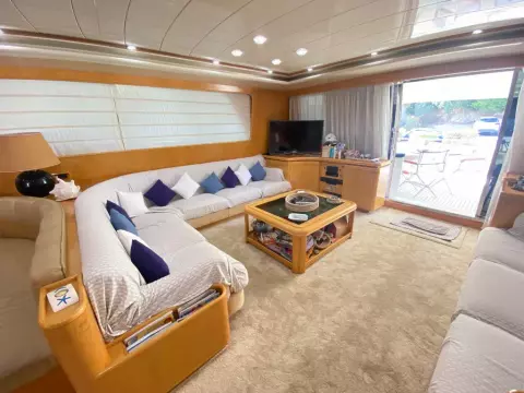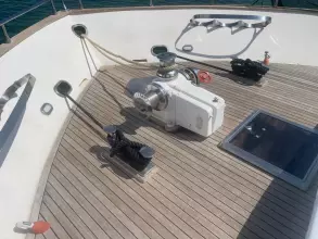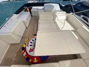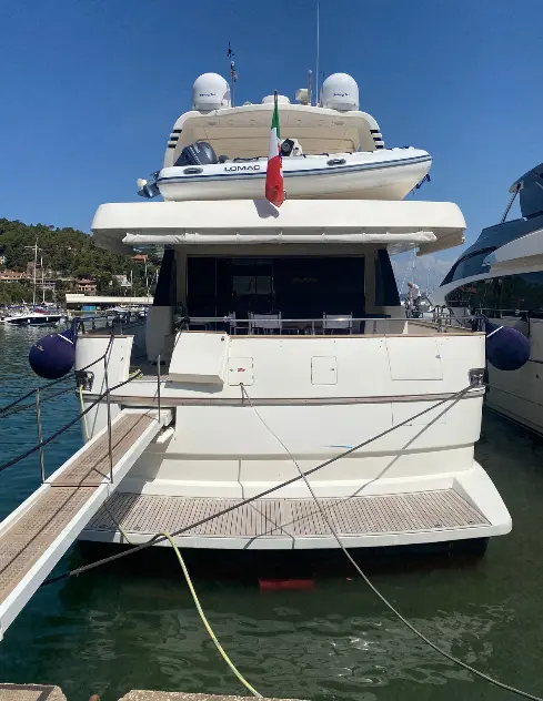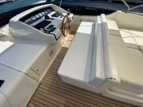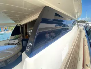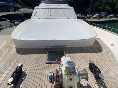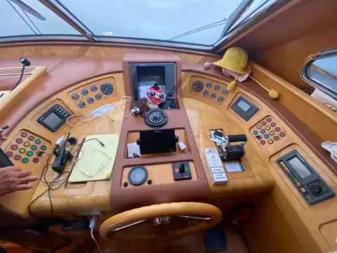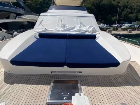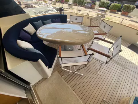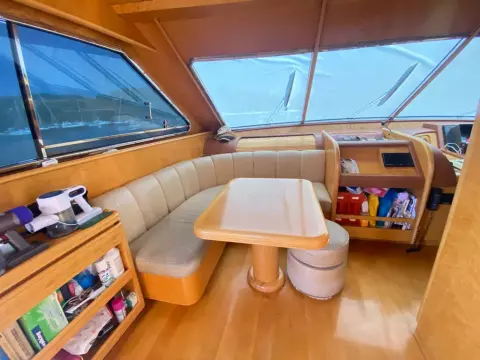 The flybridge is protected by a large bimini that covers almost the entire fly area and can be closed if necessary. In the aft area of the flybridge we find the 4.50-meter Tender with the 40-hp Yamaha outboard engine. An L-shaped sofa with table follows, to the LEFT we find a cabinet equipped with cooking plate, sink and refrigerator. Next to it is a bench box with seating and in front is a large sundeck where you can relax. The helm station on the flybridge ah a long 4-seater. Next to the bridge we find the entrance to the main deck.
