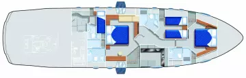 There are two twin beds in the third guest cabin, with a third rollaway bed. The bathroom serving it has a second access from the hallway and also functions as a day toilet.