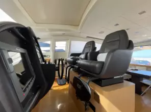 The cockpit, on the other hand, is dominated by an L-shaped sofa that frames a table around which up to eight people find space to dine comfortably.