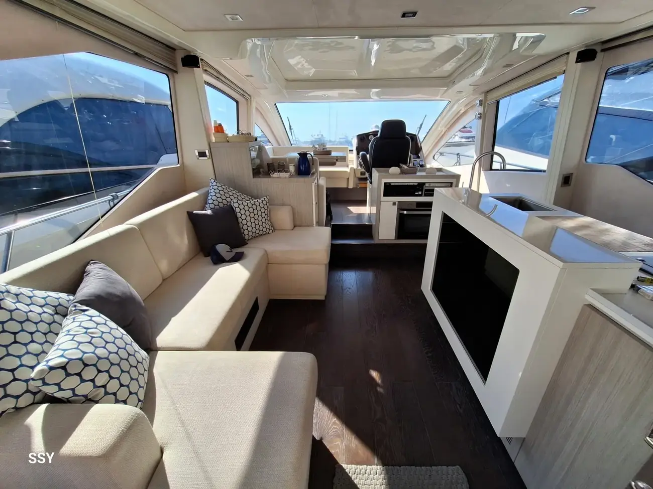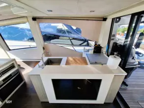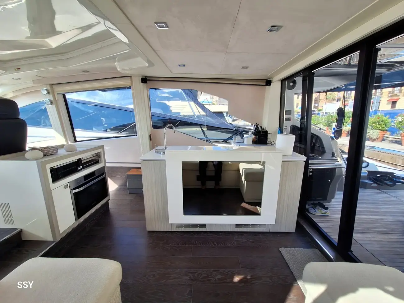 tender garage. Second helm station equipped with IPS joystick, bow thruster, Volvo Penta LCD display, sink, and icemaker.