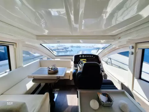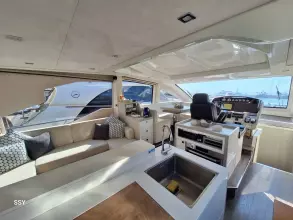 Dining & relaxation area: large portside sofa with smart TV, dining table further forward on the port side, and centrally positioned helm station.