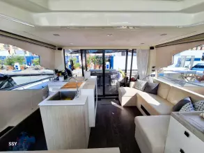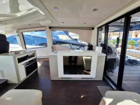 Salon & galley: bright, open spaces with panoramic windows. Fully equipped galley featuring Foster induction hob, minibar, full-height fridge and freezer, Samsung digital combi oven, and Electrolux dishwasher.