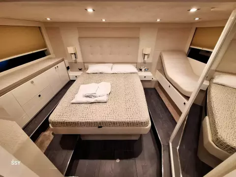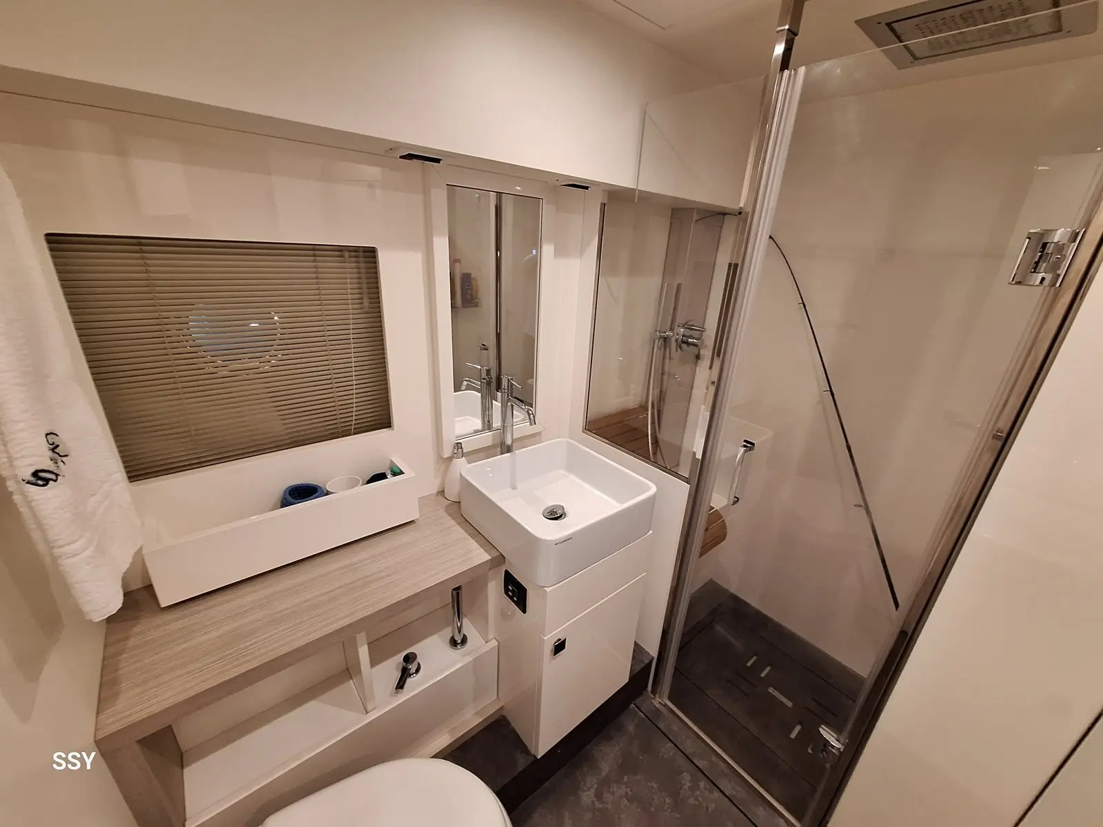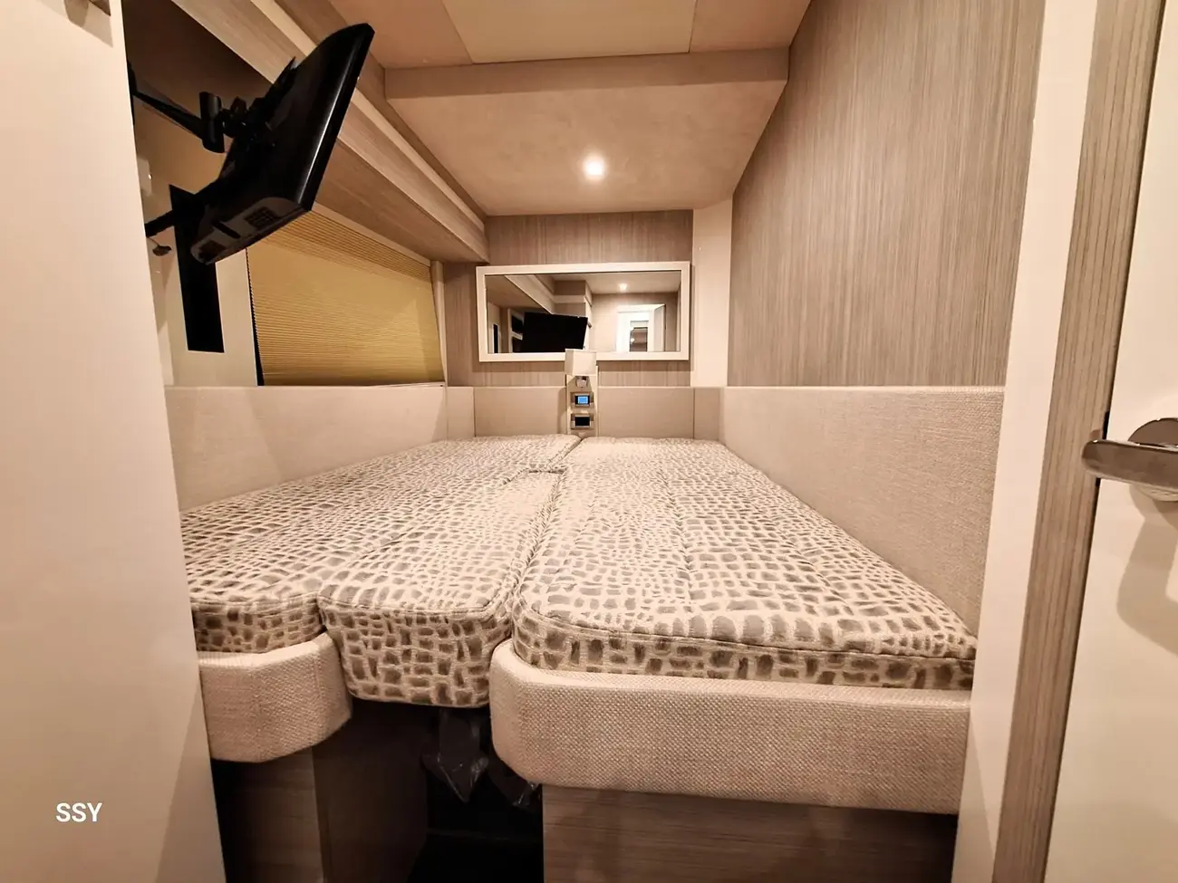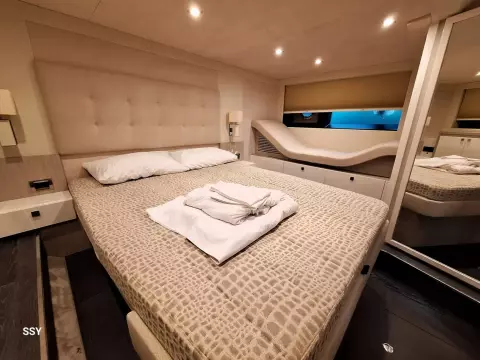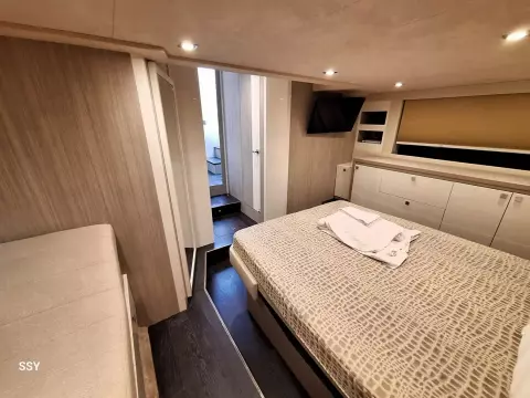 Owner’s cabin (midship, full-beam): double bed, chaise longue with sea view, Samsungsmart TV, Fusion RA700 HIFI, large walk-in closet with safe, and private ensuite with shower.