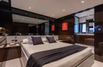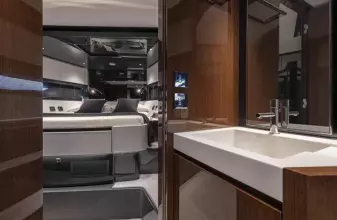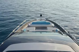 5.29-meter beam, it offers spacious interiors and exteriors. Powered by twin MAN 1650HP engines, it reaches speeds up to 40 knots. Accommodating 16 guests, it features three elegant cabins with chocolate wengé wood and a crew cabin. Amenities include sunbeds, a swim ladder, Seakeeper NG9 stabilizer, Garmin navigation, air conditioning, and entertainment systems. With a 3,800-liter fuel tank and 600-liter water tank, it’s ideal for extended voyages. The yacht is currently visible in Sanremo, Italy.