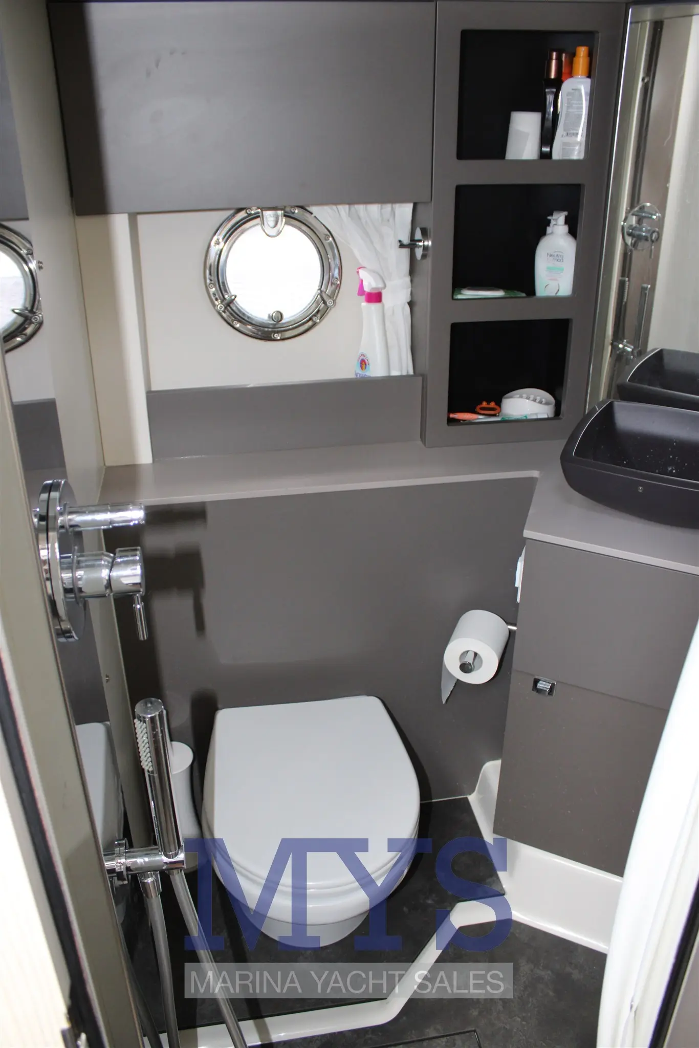 - 1 Forward master double cabin with bathroom complete with sink, shower, and electric marine toilet