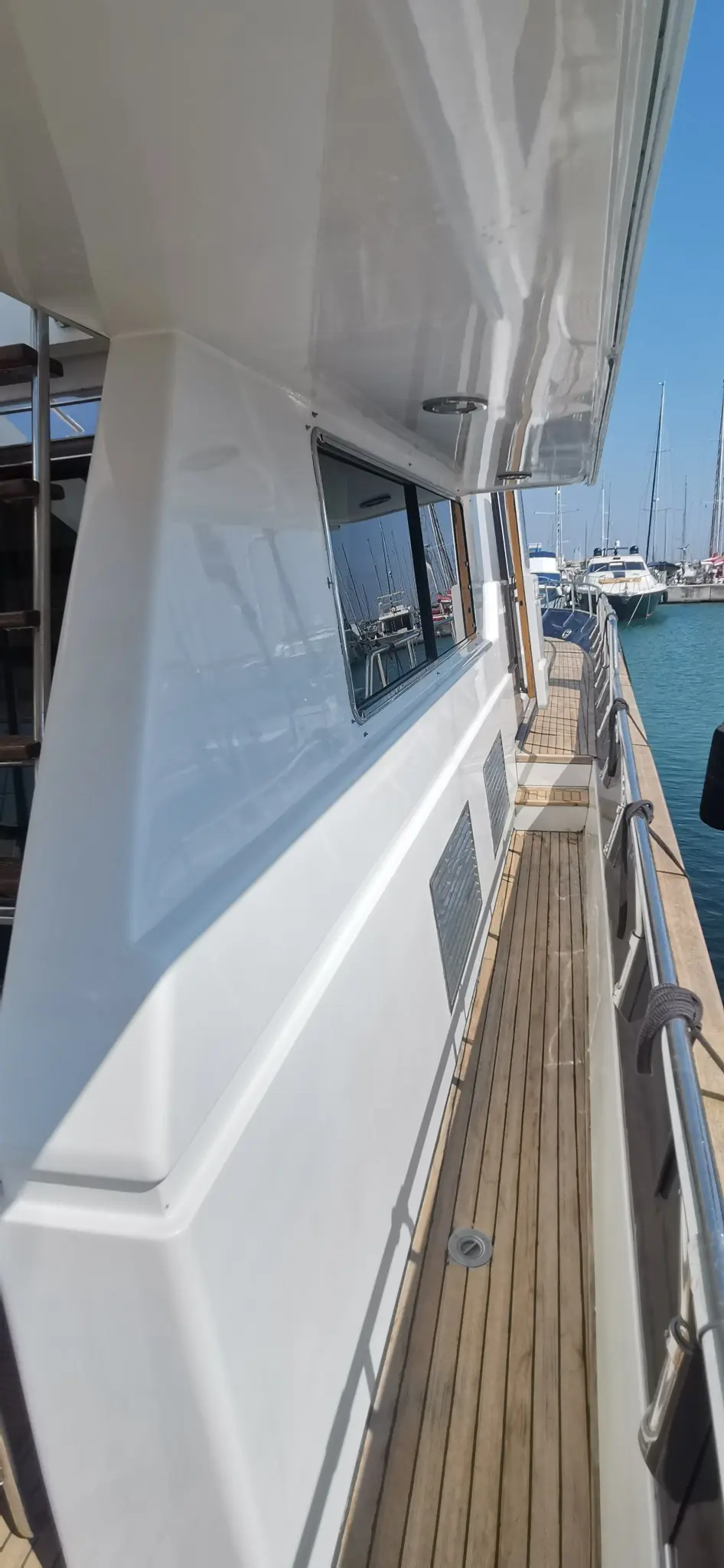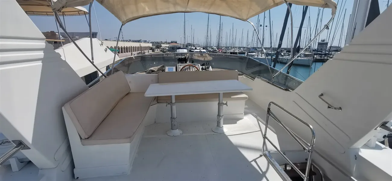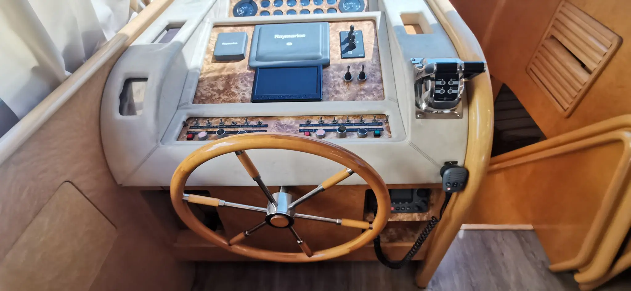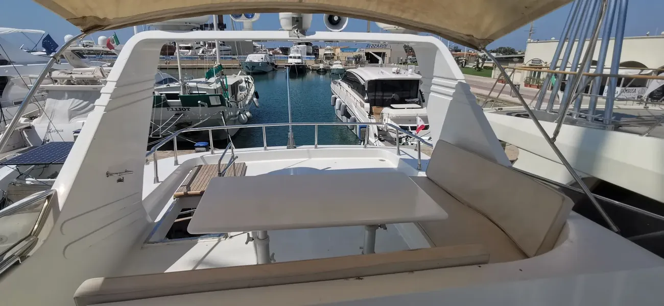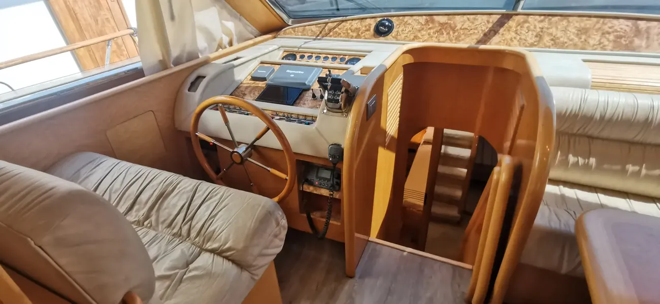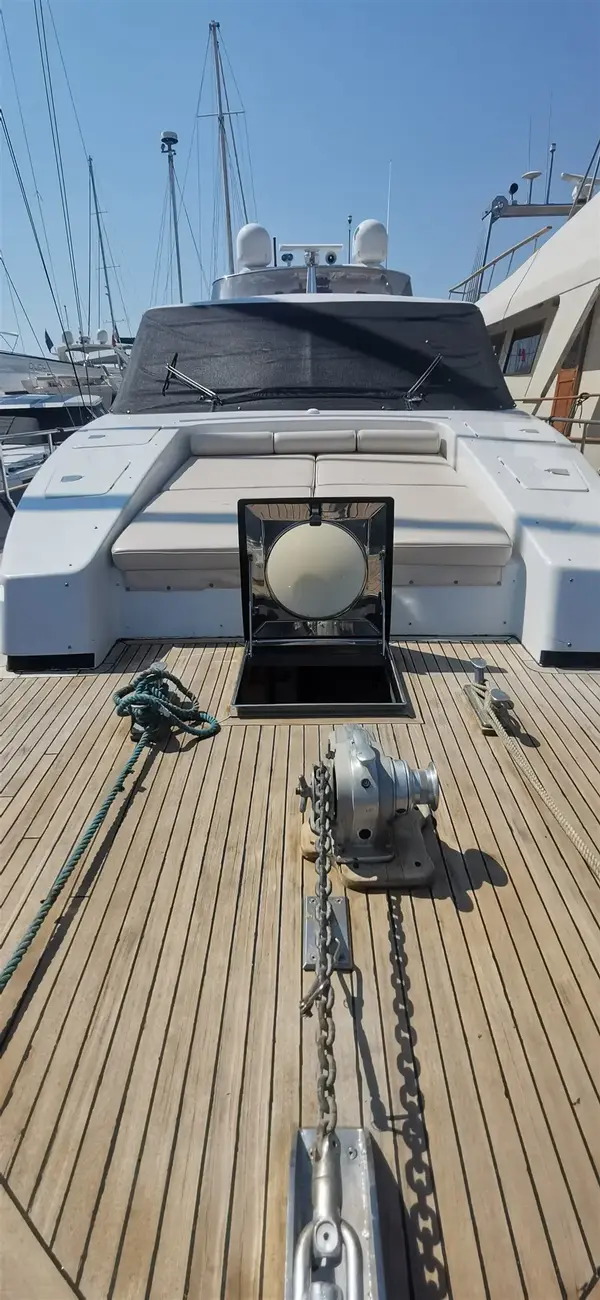 1988 boat, total Refit 2022/2023, new gunwale, engines replaced new in 2017, engines landed in 2025, the right brought to 0 hours and the left complete service, engine room camera, appliances as new, stereo in all cabins, external 24v direct current sockets. Double master cabin with ensuite bathroom and walk-in closet, twin guest cabin with single beds and en-suite bathroom, double guest cabin with en-suite bathroom, sailor cabin with bow facilities, double saloon with double sofa and table, separate kitchen with ceramic hob, oven, sink, fridge and dishwasher, large cockpit with table, folding table on the fly with L-shaped sofa, bridge on the fly with instrumentation, comfortable sundeck in the bow, oversized aft platform. Document not valid for contractual purposes. information as provided to us is correct but not guaranteed. Mediation fees 5% + VAT on the purchase price and not less than € 2000 + VAT. Navigation equipment: Electronic engine control, GPS (Raymarine E80), Intercom, Autopilot (Raymarine ST6002), VHF Radio (Raymarine RAY218E), SSB. Staging and technical: Fume/Gas Detector, Bilge Alarm, Water pressure pump, 20 Batteries, Teak Side Decks, Deck Shower, Twin Steering, Directional Spotlight, Hydraulic Flaps, Fire Extinguishing System, Flaps Indicators, Courtesy Lights, Underwater lights, Gangway (Elettrica), Platform, Entry door, Side door, Teak Cockpit, Shorepower connector, Voltage Rectifier, Electric Windlass (Lofrans 1500w 24v), swimming ladder, Saddles for tender, Waste Water Purifier System, cockpit table. Domestic Facilities onboard: Air Conditioning (Da ripristinare), Warm Water System, Watermaker, Waste Water Plant, Interior wooden floor (e moquette nelle cabine), 12V Outlets, Black Water Tank, 3 Electric Toilet. Security equipment: Radar reflector. Entertainment: Speakers (Interni ed esterni), DTV, Radio AM/FM, Hi-Fi, TV (In dinette). Kitchen and appliances: Galley, 2 Refrigerator (Di cui 1 in salone), Dishwasher, Microwave Oven (Whirpool), Ceramic hot plate (4 fuochi Siemens). Upholstery: Cushions, Bow Cushions, Fly Bridge Cuscions, Sunshade (Fly).