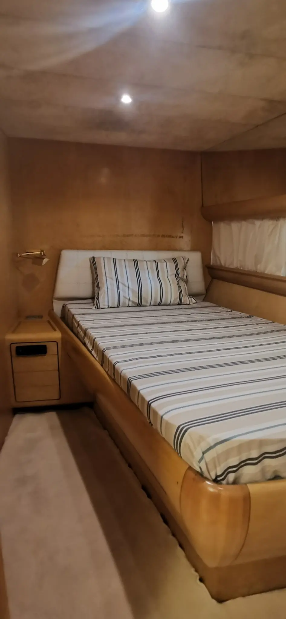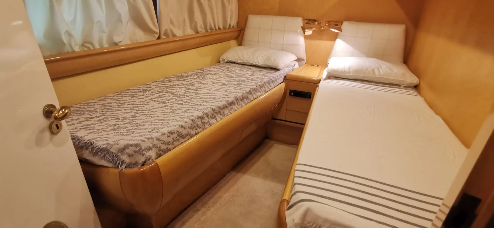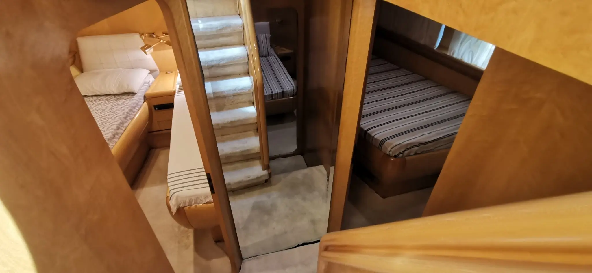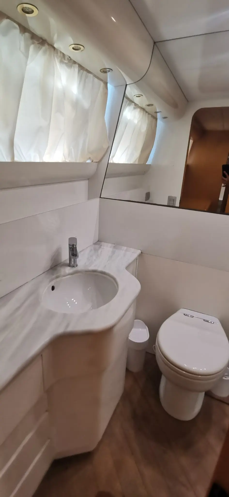 1988 boat, total Refit 2022/2023, new gunwale, engines replaced new in 2017, engines landed in 2025, the right brought to 0 hours and the left complete service, engine room camera, appliances as new, stereo in all cabins, external 24v direct current sockets. Double master cabin with ensuite bathroom and walk-in closet, twin guest cabin with single beds and en-suite bathroom, double guest cabin with en-suite bathroom, sailor cabin with bow facilities, double saloon with double sofa and table, separate kitchen with ceramic hob, oven, sink, fridge and dishwasher, large cockpit with table, folding table on the fly with L-shaped sofa, bridge on the fly with instrumentation, comfortable sundeck in the bow, oversized aft platform. Document not valid for contractual purposes. information as provided to us is correct but not guaranteed. Mediation fees 5% + VAT on the purchase price and not less than € 2000 + VAT. Navigation equipment: Electronic engine control, GPS (Raymarine E80), Intercom, Autopilot (Raymarine ST6002), VHF Radio (Raymarine RAY218E), SSB. Staging and technical: Fume/Gas Detector, Bilge Alarm, Water pressure pump, 20 Batteries, Teak Side Decks, Deck Shower, Twin Steering, Directional Spotlight, Hydraulic Flaps, Fire Extinguishing System, Flaps Indicators, Courtesy Lights, Underwater lights, Gangway (Elettrica), Platform, Entry door, Side door, Teak Cockpit, Shorepower connector, Voltage Rectifier, Electric Windlass (Lofrans 1500w 24v), swimming ladder, Saddles for tender, Waste Water Purifier System, cockpit table. Domestic Facilities onboard: Air Conditioning (Da ripristinare), Warm Water System, Watermaker, Waste Water Plant, Interior wooden floor (e moquette nelle cabine), 12V Outlets, Black Water Tank, 3 Electric Toilet. Security equipment: Radar reflector. Entertainment: Speakers (Interni ed esterni), DTV, Radio AM/FM, Hi-Fi, TV (In dinette). Kitchen and appliances: Galley, 2 Refrigerator (Di cui 1 in salone), Dishwasher, Microwave Oven (Whirpool), Ceramic hot plate (4 fuochi Siemens). Upholstery: Cushions, Bow Cushions, Fly Bridge Cuscions, Sunshade (Fly).