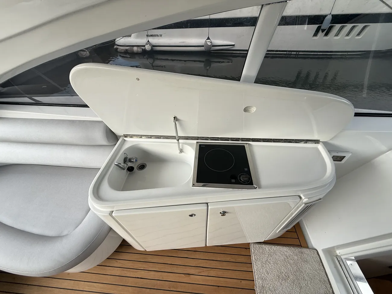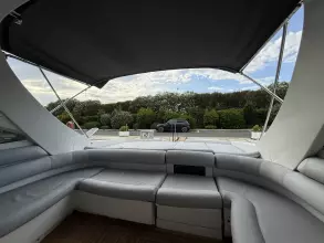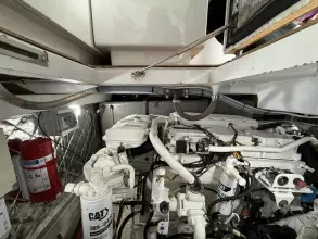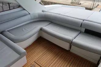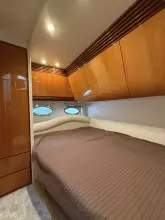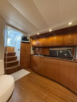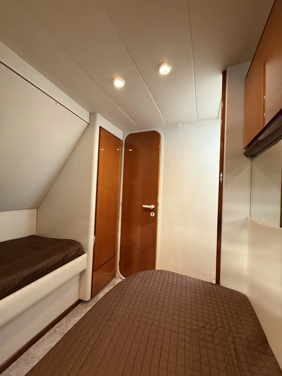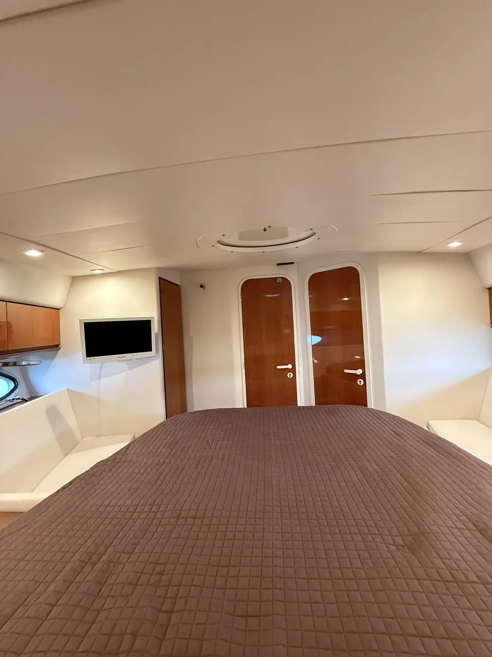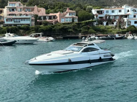 Equipped with two 660 hp Caterpillar engines, it reaches a maximum speed of 34 knots and a stable and smooth cruising speed of 26 knots, ensuring a dynamic and safe sailing experience. The technical equipment is complete: bow thruster, autopilot, GPS, plotter, radar, echo sounder, and efficient on-board electronics ensure full control in every situation.