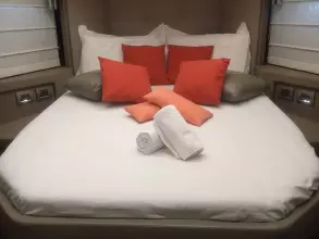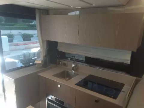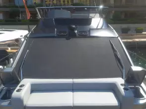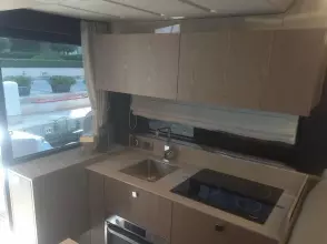 Features three cabins and two bathrooms. Spacious flybridge with a bright and modern living space. Premium finishes and sleek design.
