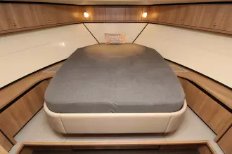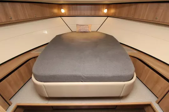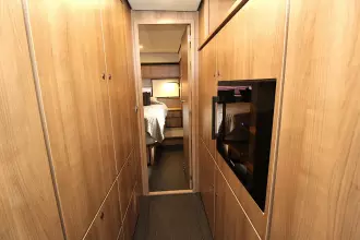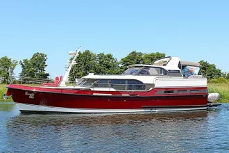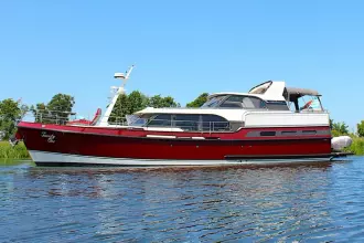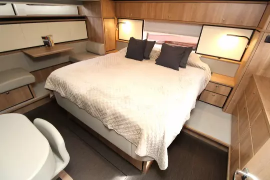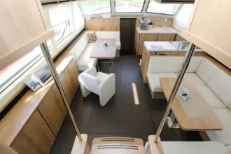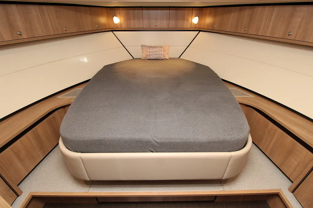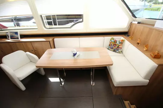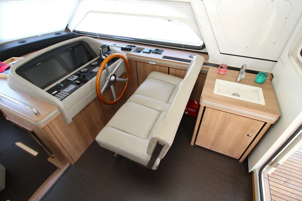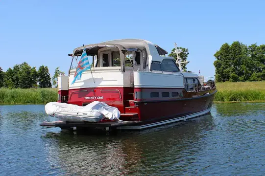 Indeling: Het interieur is stijlvol afgewerkt met hoogwaardige materialen. De royale salon biedt veel daglicht en zicht rondom. De eigenaarshut over de volle breedte beschikt over een eigen ruime badkamer. Daarnaast zijn er twee comfortabele gastenhutten met gedeelde ruime natte cel. De unieke Variotop maakt het stuurhuis flexibel inzetbaar, als open of gesloten pilothouse.