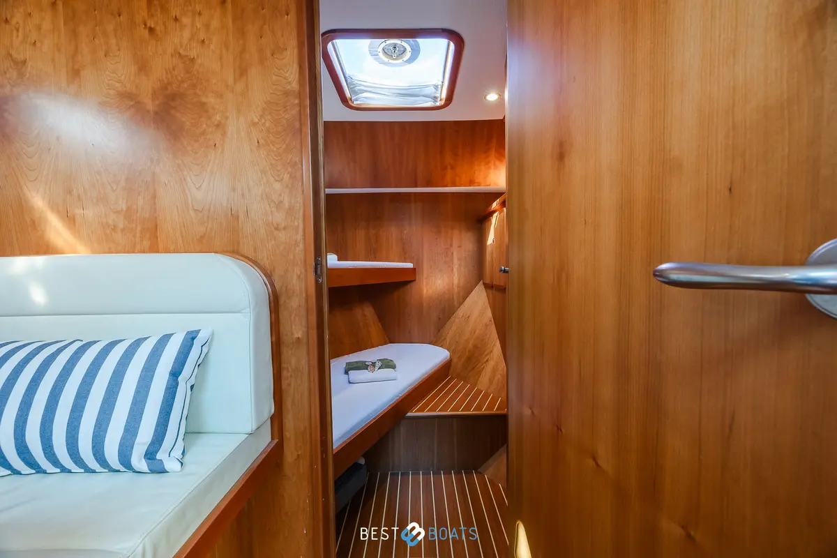 Onboard, you will immediately experience the warm, inviting atmosphere characteristic of Linssen. The salon is stylishly furnished and offers ample seating to relax and enjoy the view. In the fore cabin, there is a fully equipped galley with a three-burner gas stove and a spacious refrigerator with a freezer compartment, opposite a cozy dinette that can easily be converted into an extra sleeping space. The guest cabin at the front features two comfortable single beds and a private toilet, while the spacious owner’s cabin in the aft is equipped with a large double bed and an en-suite bathroom with a shower. In total, there are four fixed sleeping places onboard, with the possibility to create two additional ones.