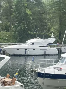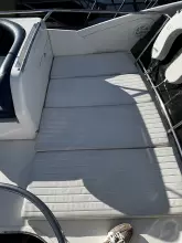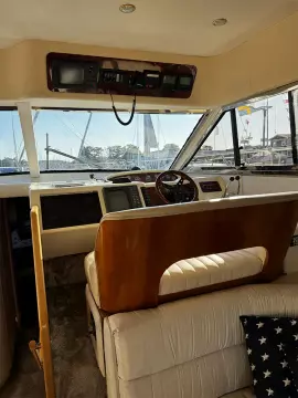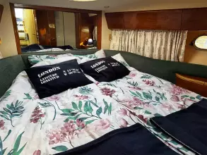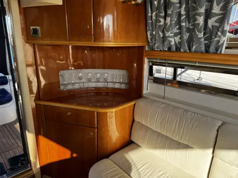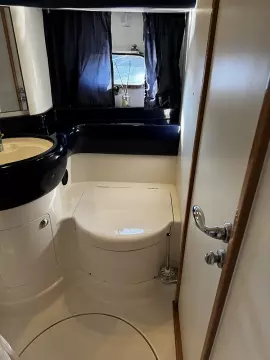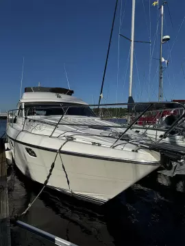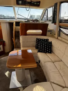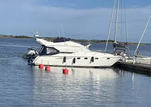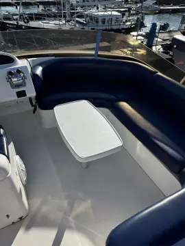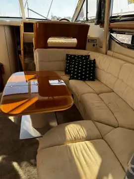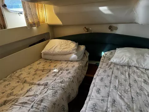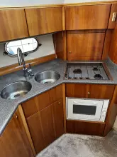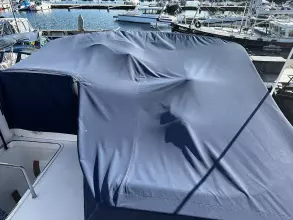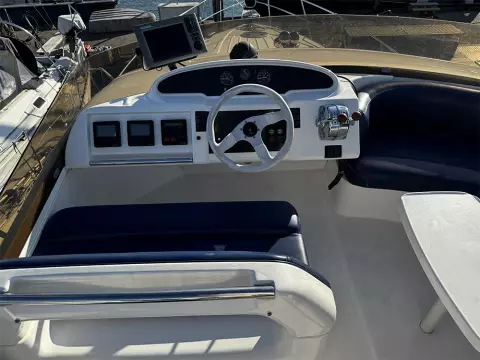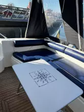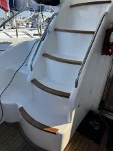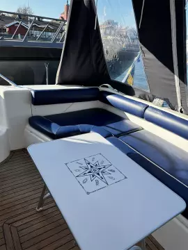 A very nice model with an integrated staircase leading to a spacious flybridge with a helm for two, a sofa, and a table, with a sunbed located behind. Large, generous cockpit with a sofa and space for a dining table. Teak decking in the cockpit and on the aft platform. Very bright salon with a large galley featuring a refrigerator, gas stove, oven, and microwave. Two heads with showers. Shower also on the aft platform. Master cabin with access to a bathroom. Guest cabin with two berths. Additional sleeping possibilities in the salon.