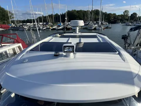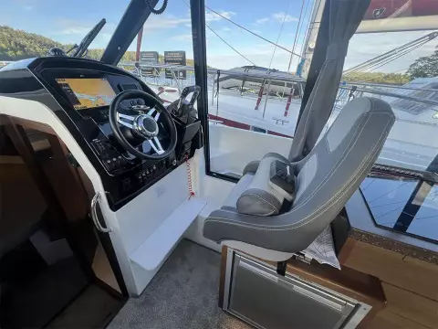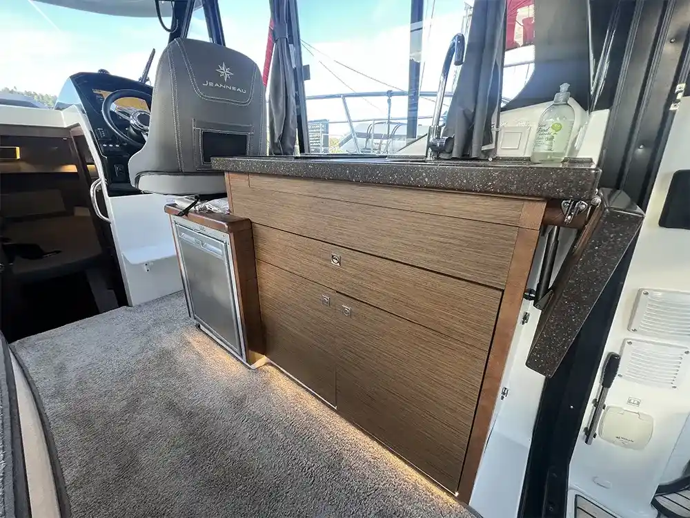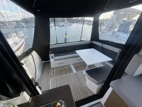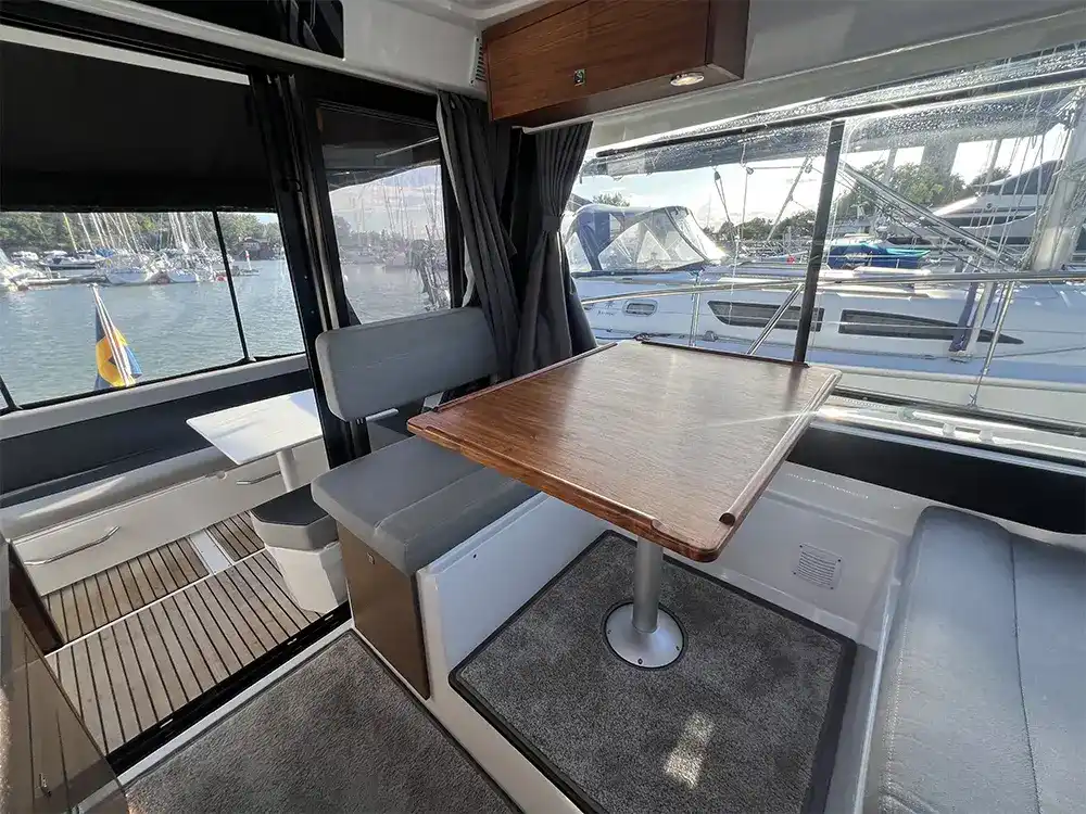 • Saloon: U-shaped dinette with table (convertible to double berth), direct access to cockpit with sunpad, side door from helm to foredeck