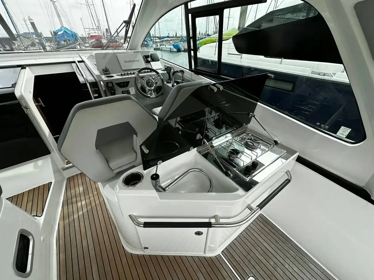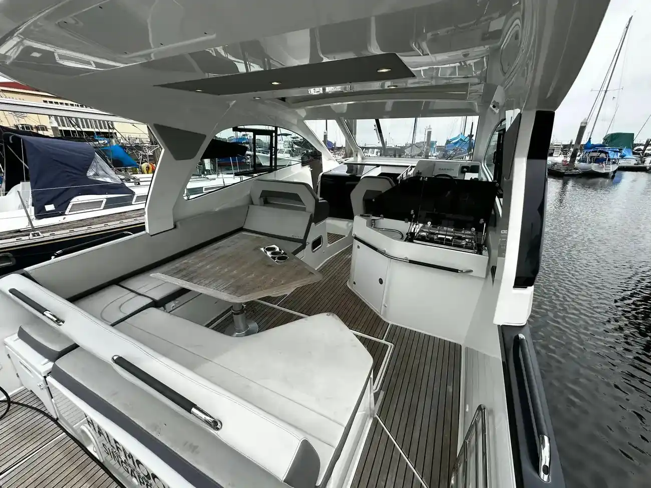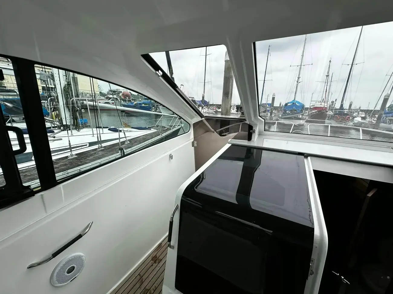 The hardtop offers valuable shade and shelter to the cockpit when needed, while its electrically opening feature allows for refreshing breezes whenever desired.