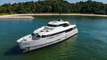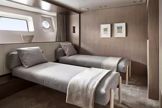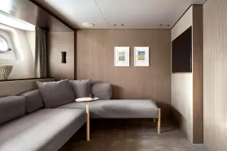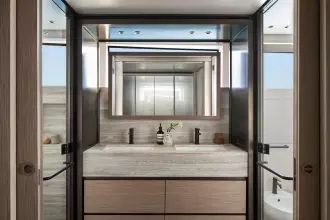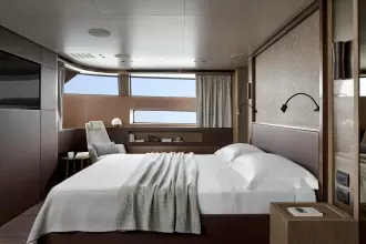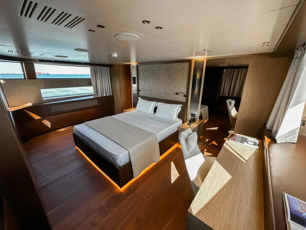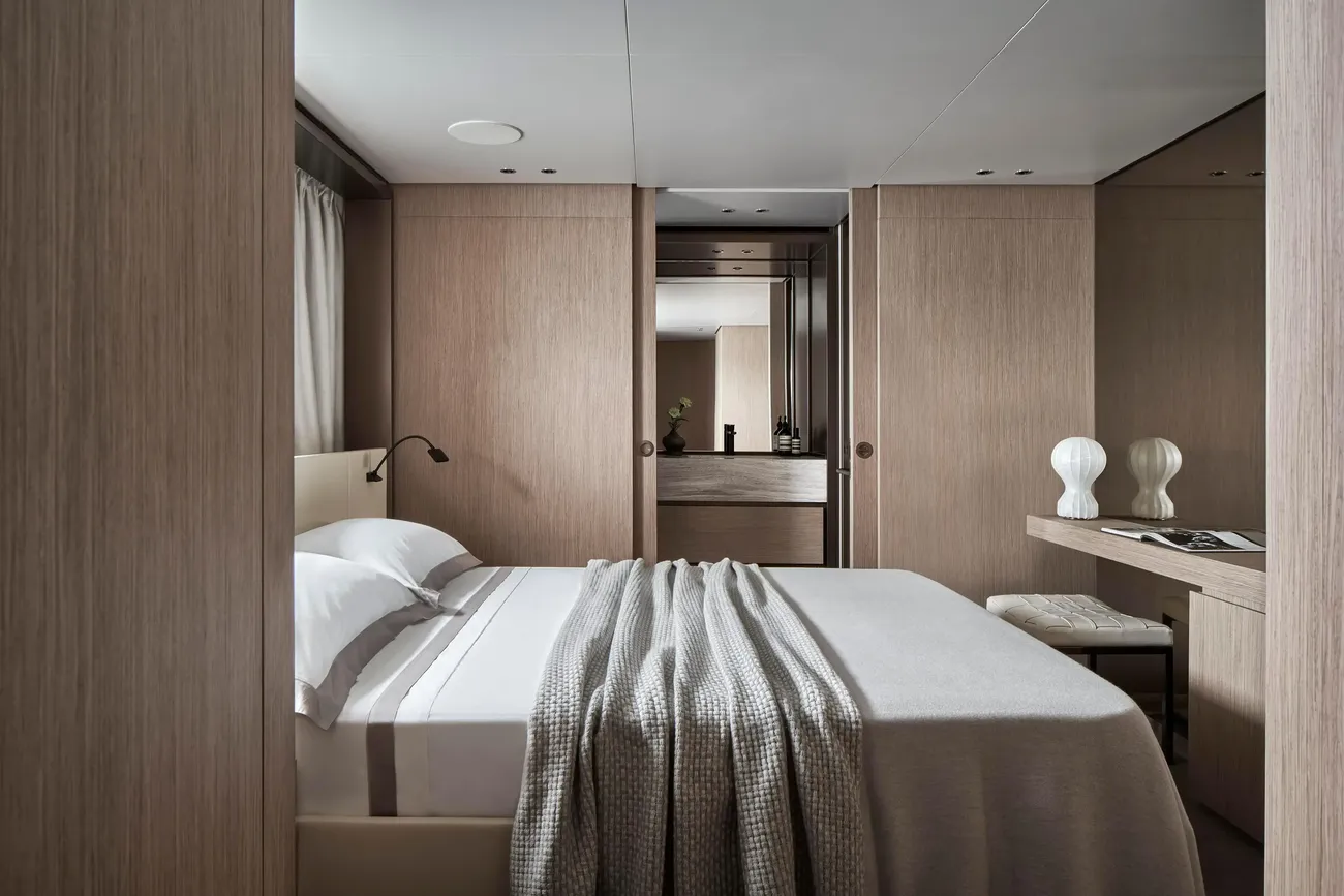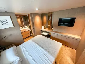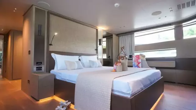 With the exterior design by Zuccon International, alongside her bright, light-filled interiors, blending indoor and outdoor living, creating an atmosphere of openness and connection with the sea. The yacht's impressive master suite is on the main deck, while the three beautifully appointed guest cabins are on the lower deck - each with its own ensuite, including one full-beam VIP, ensuring exceptional comfort for friends and family.