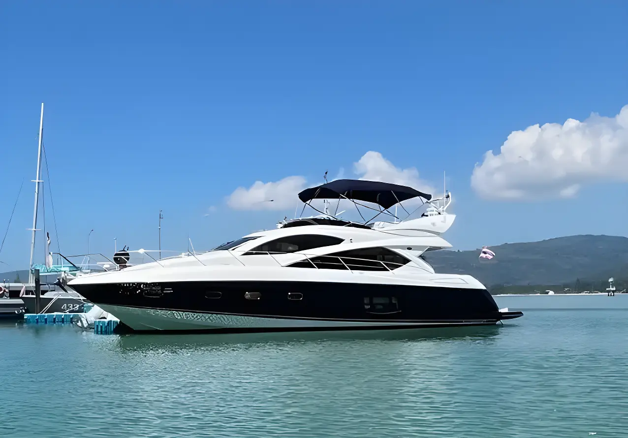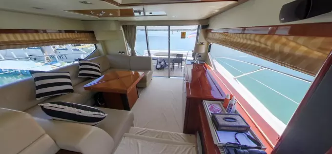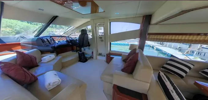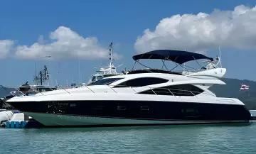 The Sunseeker Manhattan 60 is a luxurious flybridge motor yacht known for its blend of performance and comfort. With sleek, exterior lines and spacious interior layout, it accommodates up to six guests across three cabins, plus a crew cabin aft.