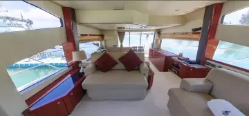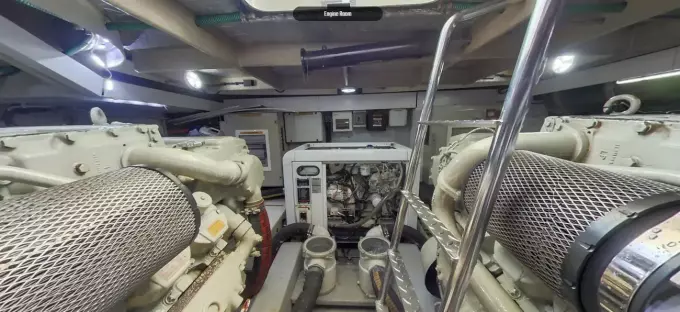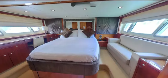 The yacht cruises at a speed of 23 knots, and features several advanced systems, including a bow thruster for easy docking, a hydraulic swim platform for launching the dinghy and making swimming and diving simple.