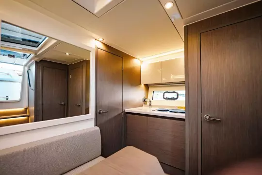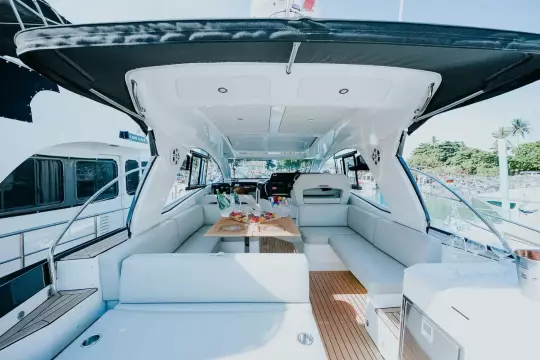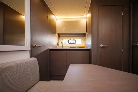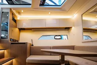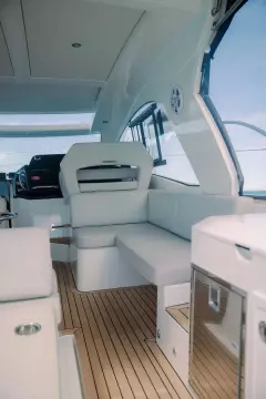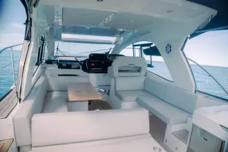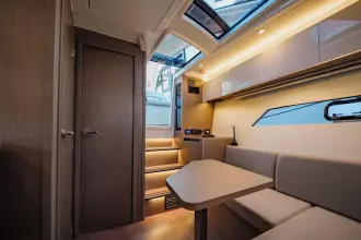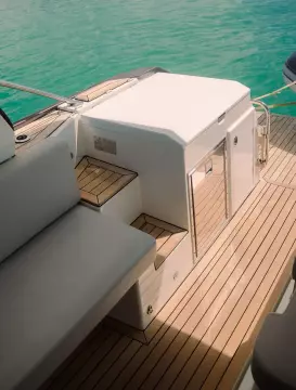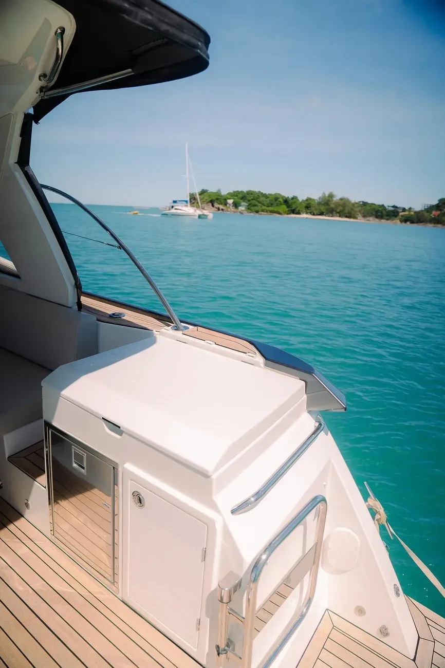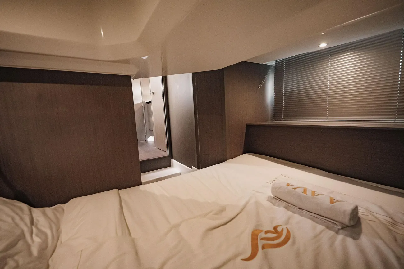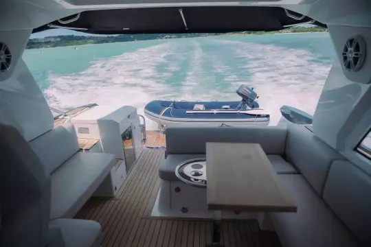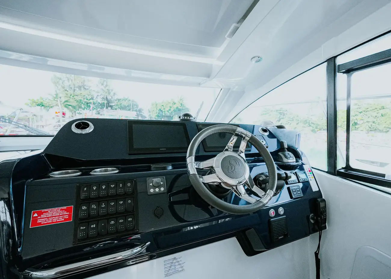 She offers a spacious cockpit, with an open layout, outdoor galley, and ample seating, the cockpit is perfect for entertaining or unwinding with panoramic views and with the electric controlled sunroof that offers the flexibility of open-air cruising or shaded comfort at the touch of a button.