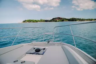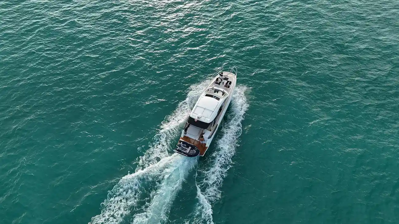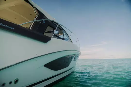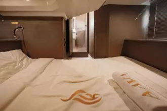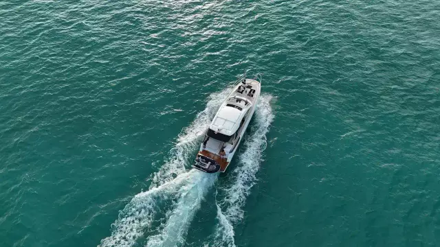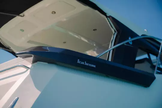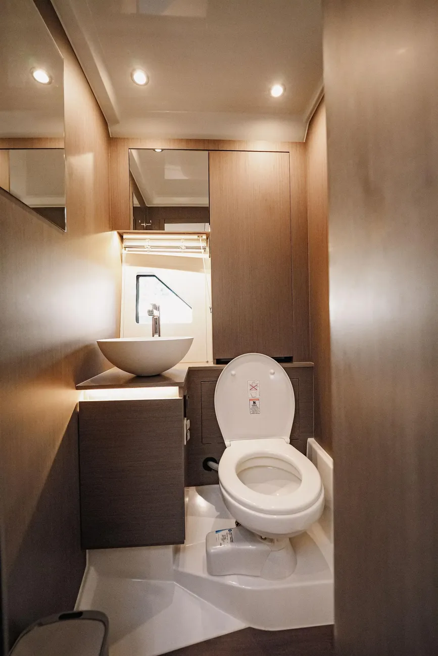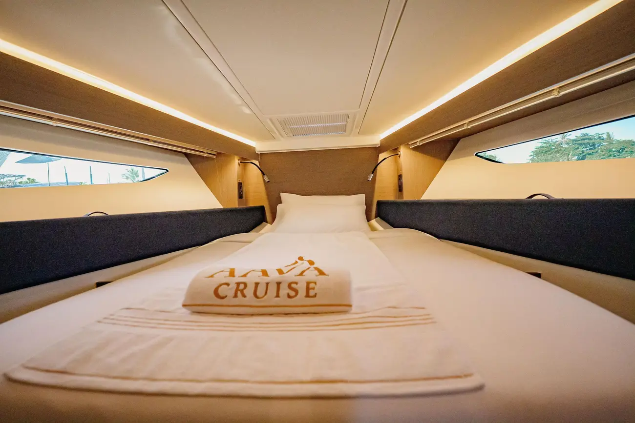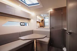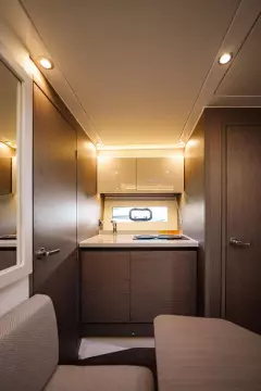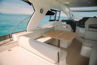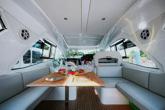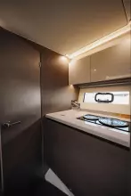 She offers a spacious cockpit, with an open layout, outdoor galley, and ample seating, the cockpit is perfect for entertaining or unwinding with panoramic views and with the electric controlled sunroof that offers the flexibility of open-air cruising or shaded comfort at the touch of a button.