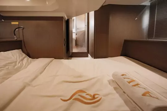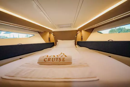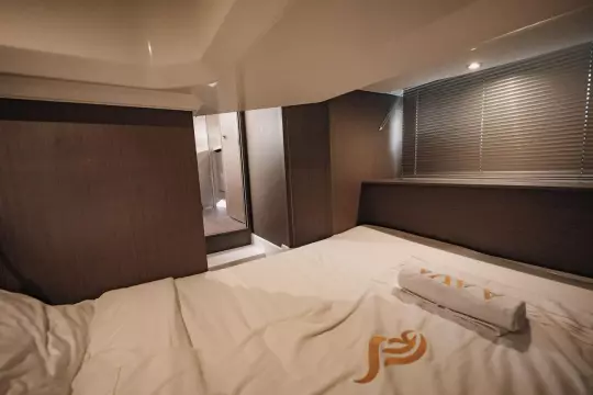 Below deck, enjoy a well-appointed salon, full galley, and two private cabins, making overnight stays comfortable and luxurious.