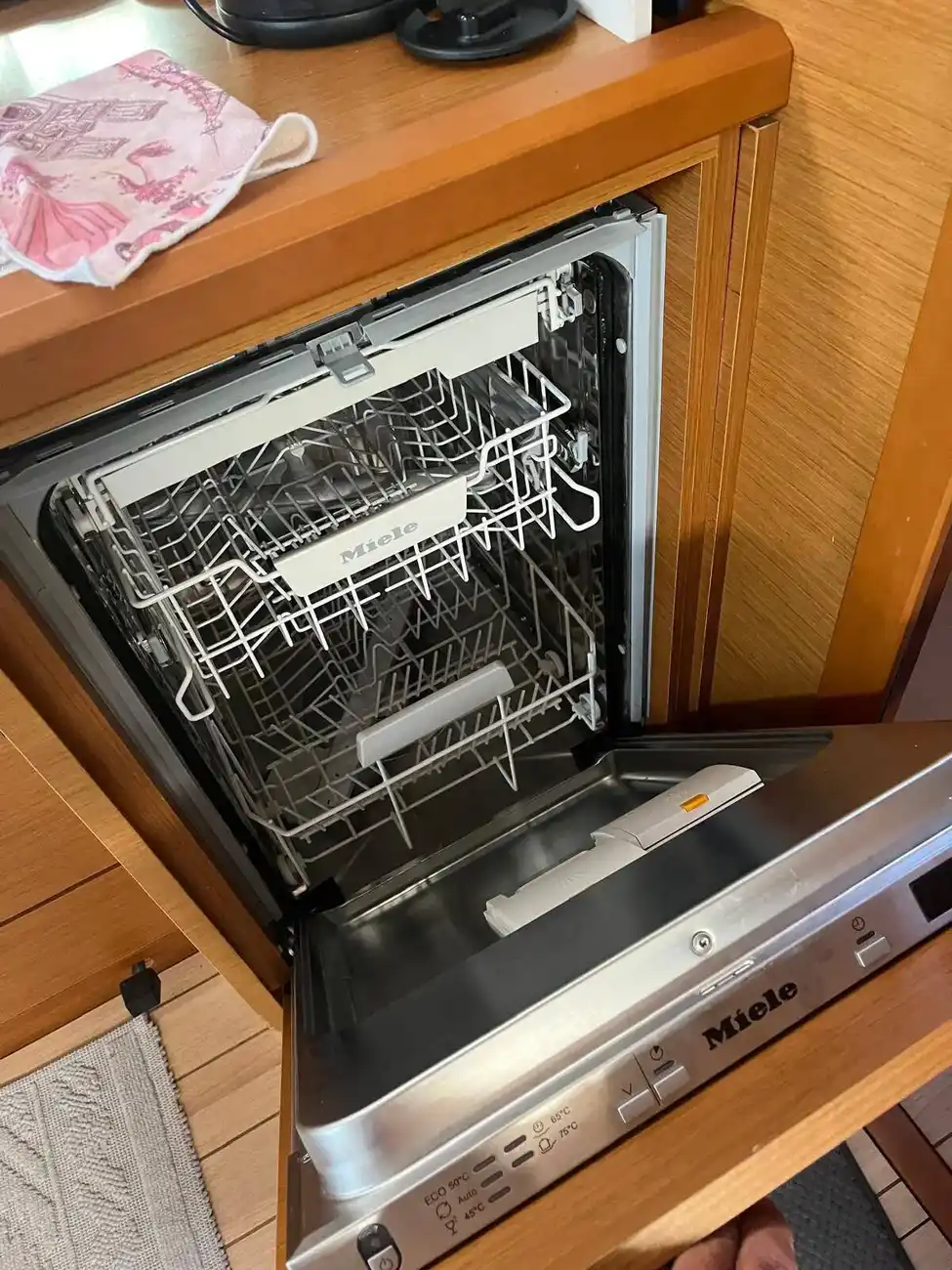 Fully equipped galley with stove, oven, fridge/freezer, and ample storage.