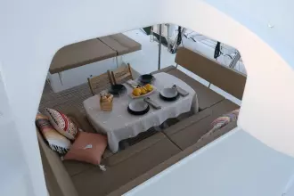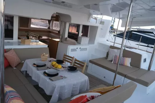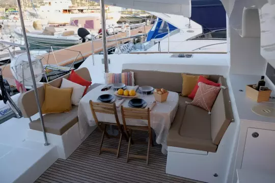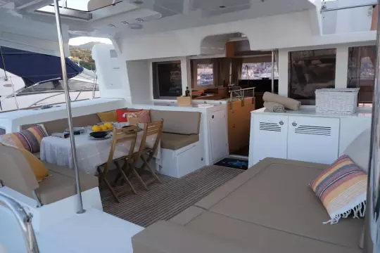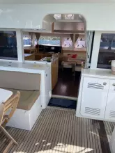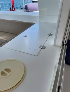 Galley in main salon to starboard with direct access to cockpit through sliding window