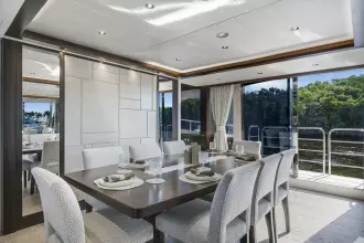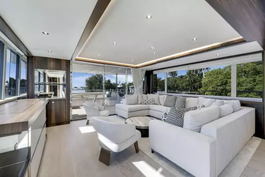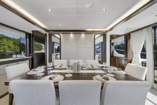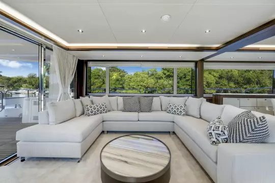 The salon and dining area are defined by sophisticated walnut cabinetry, soft LED lighting, and expansive side windows, creating a seamless indoor-outdoor connection. Custom fabrics, high-end flooring, and ambient lighting throughout further elevate the onboard experience.