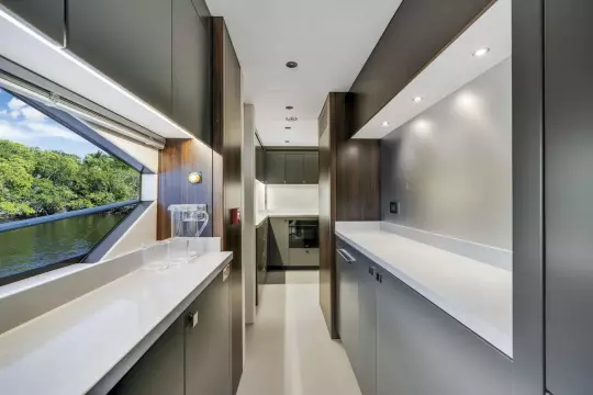 A fully equipped galley with Miele appliances is discreetly positioned to allow both guest privacy and crew efficiency, while the dedicated crew quarters (4 berths, 2 heads) are thoughtfully separated aft with private access, ideal for professional operation.